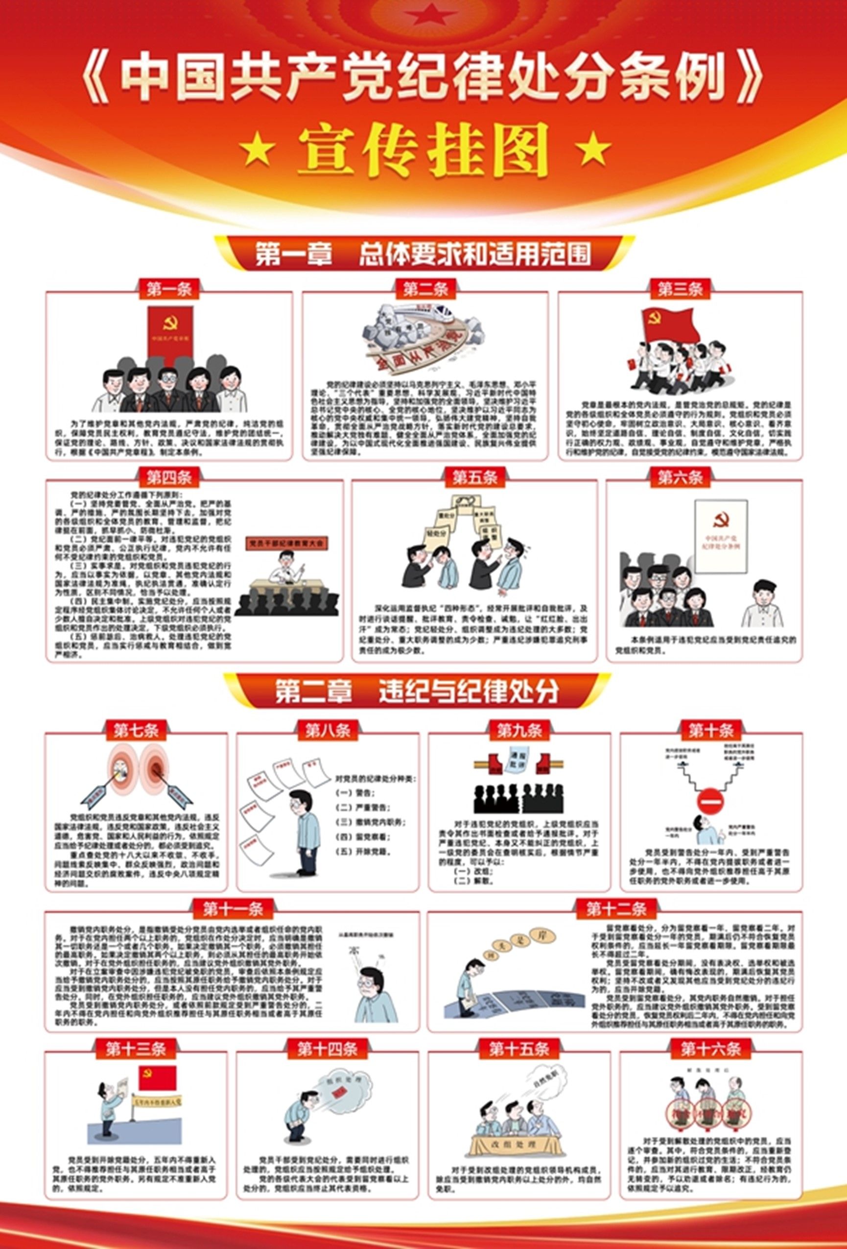 为帮助广大党员、干部更好地学习理解修订后的《中国共产党纪律处分条例》,更好营造学纪知纪明纪守纪浓厚氛围,我校党纪学习教育领导小组办公室准备了《中国共产党纪律处分条例》宣传挂图,将于5月8日至10日在东校区师生活动中心广场展出。