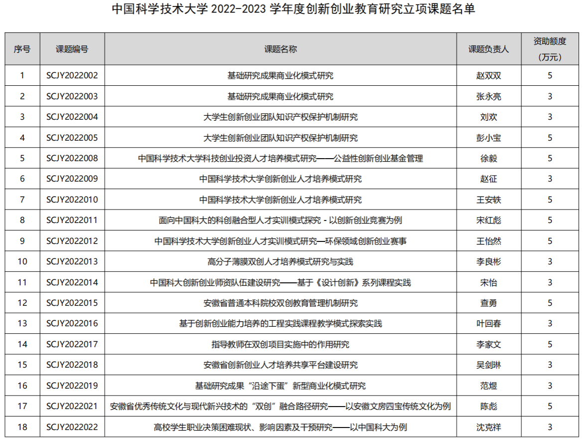 根据工作安排,中国科大2022-2023学年度“创新创业教育研究课题”(以下简称“课题”)经过资格审查、专家评审、立项公示、预立项等环节,最终确定“基础研究成果商业化模式研究”等18个课题为我校2022-2023学年度“创新创业教育研究课题”,予以资助。