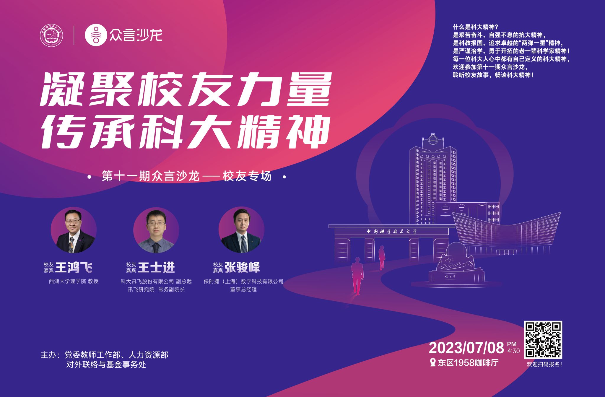 第十一期“众言沙龙”活动将以“凝聚校友力量 传承科大精神”为主题,邀请校友代表与大家面对面交流。活动将于7月8日(周六)下午4:30在东区1958咖啡厅开展,诚挚欢迎感兴趣师生和校友报名参加!报名链接:https://www.wjx.cn/vm/epT3PQO.aspx#。报名通过者将另行通知,欲报从速。