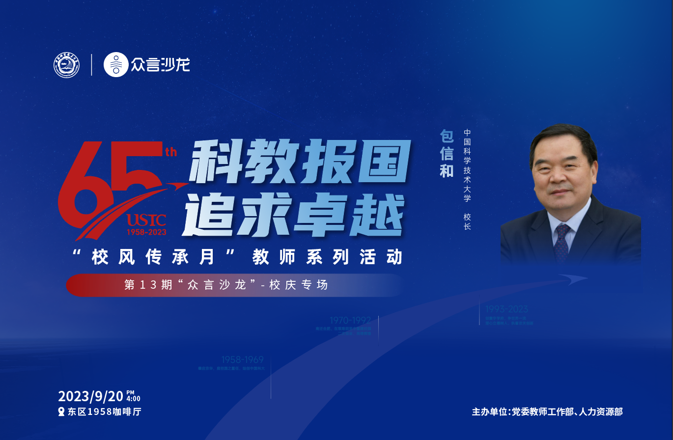 9月20日是中国科大建校65周年校庆日,作为乐鱼官网首页入口校风传承月教师系列活动之一,第13期众言沙龙将以“科教报国,追求卓越”为主题举办校庆专场活动,邀请校长包信和作为嘉宾,与教职工代表进行面对面交流。