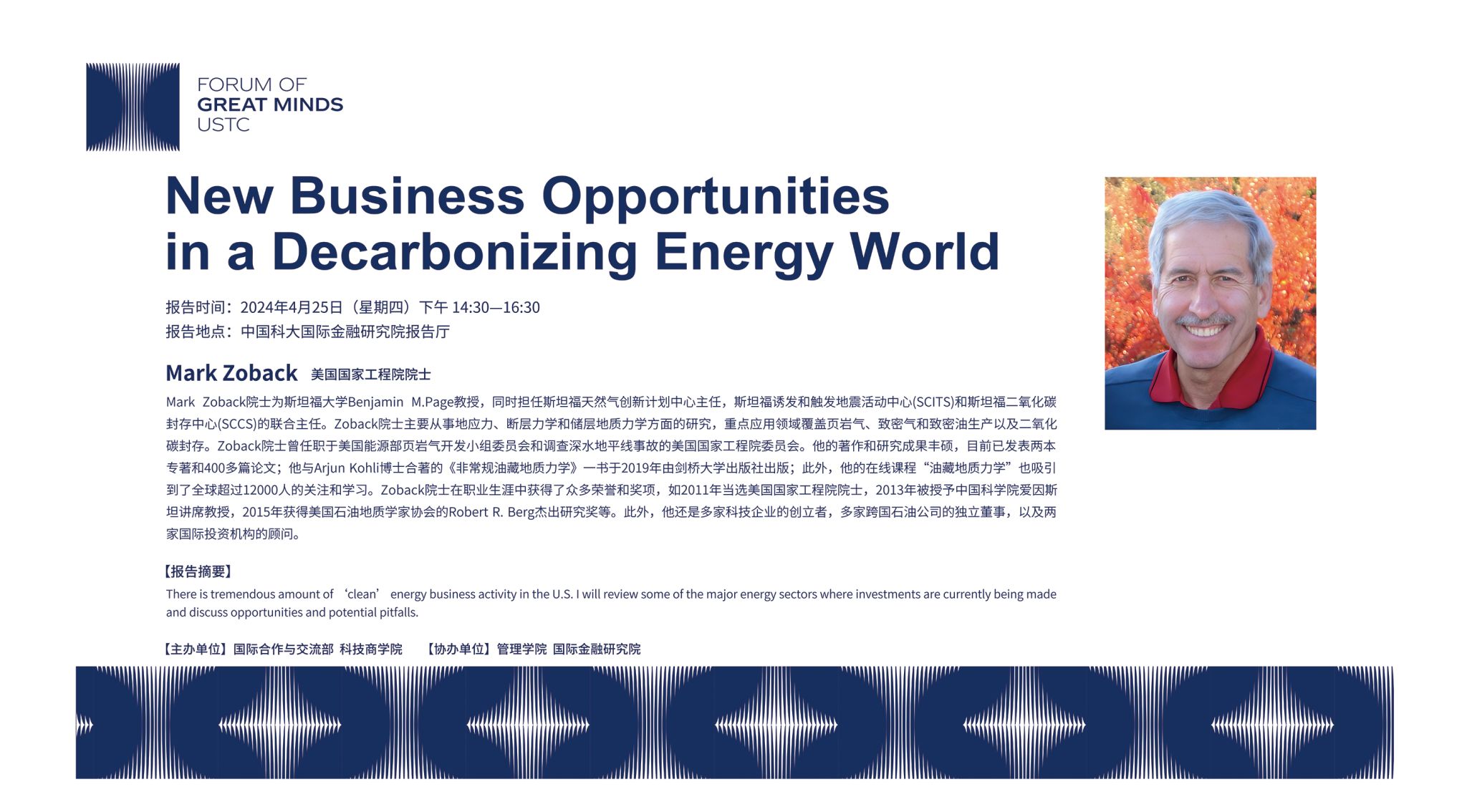 应学校邀请,美国国家工程院院士、斯坦福大学地球物理系教授Mark D. Zoback将于2024年4月25日来校作“New Business Opportunities in a Decarbonizing Energy World”学术报告。
