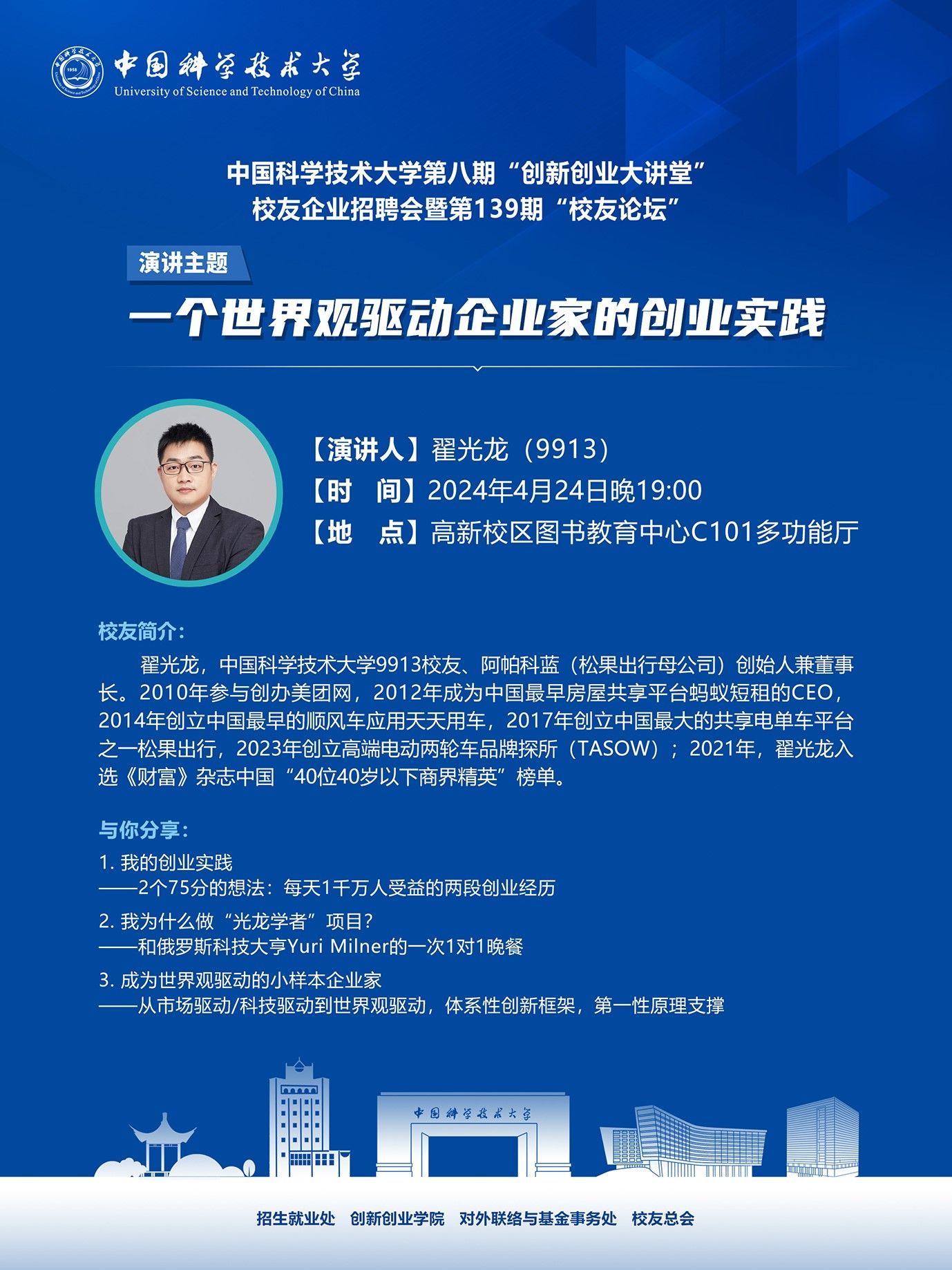 4月24日(周三)19:00,第八期“创新创业大讲堂”校友企业招聘宣讲会暨第139期“校友论坛”将在高新校区图书教育中心C101举办。我校9913校友翟光龙,阿帕科蓝(松果出行母公司)创始人兼董事长将带来主题为“一个世界观驱动企业家的创业实践”报告分享。欢迎全校感兴趣的师生参加。