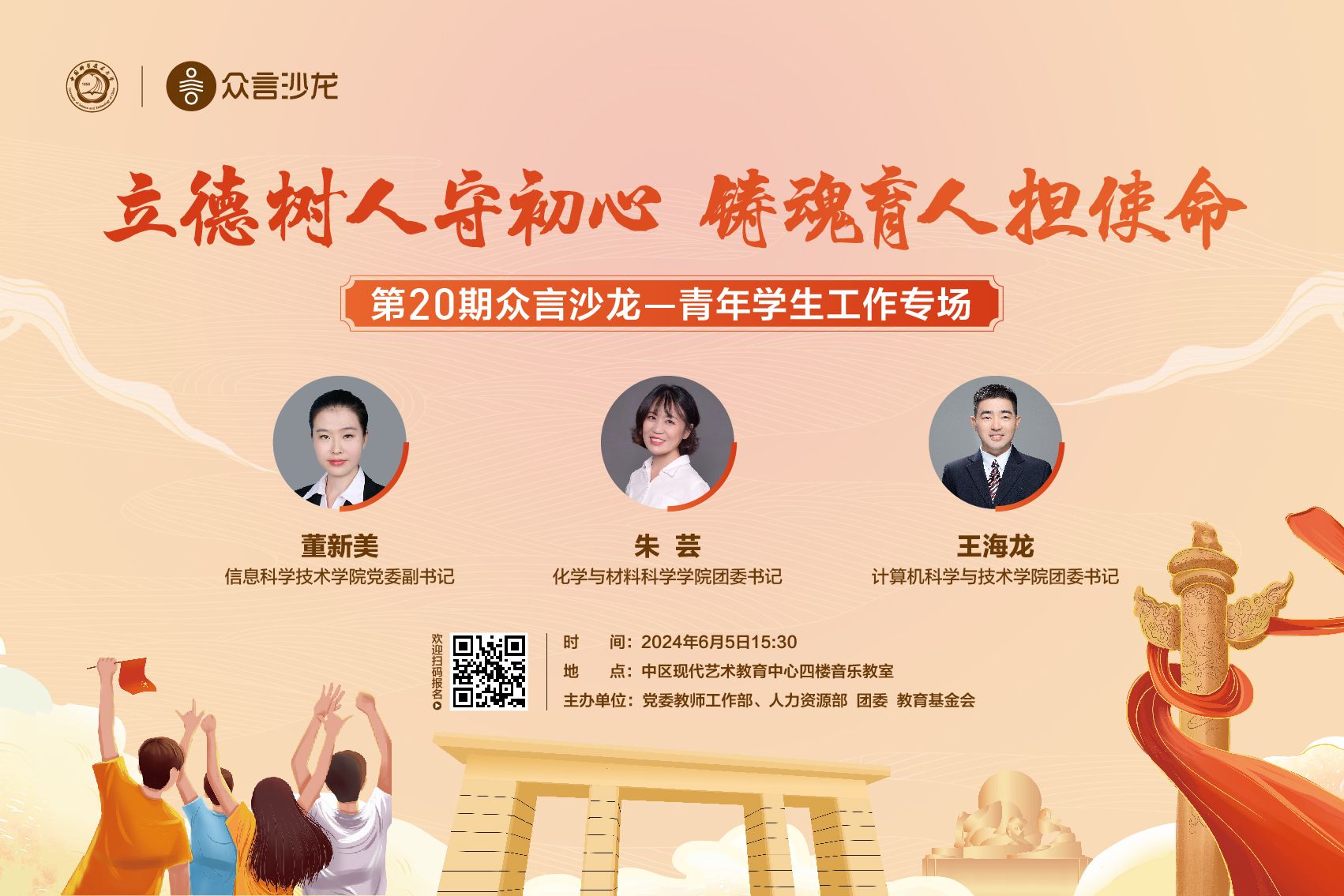 立德树人守初心,铸魂育人担使命。第20期“众言沙龙”活动将举办青年学生工作专场,邀请信息科学技术学院董新美老师、化学与材料科学学院朱芸老师、计算机科学与技术学院王海龙老师与大家面对面交流。