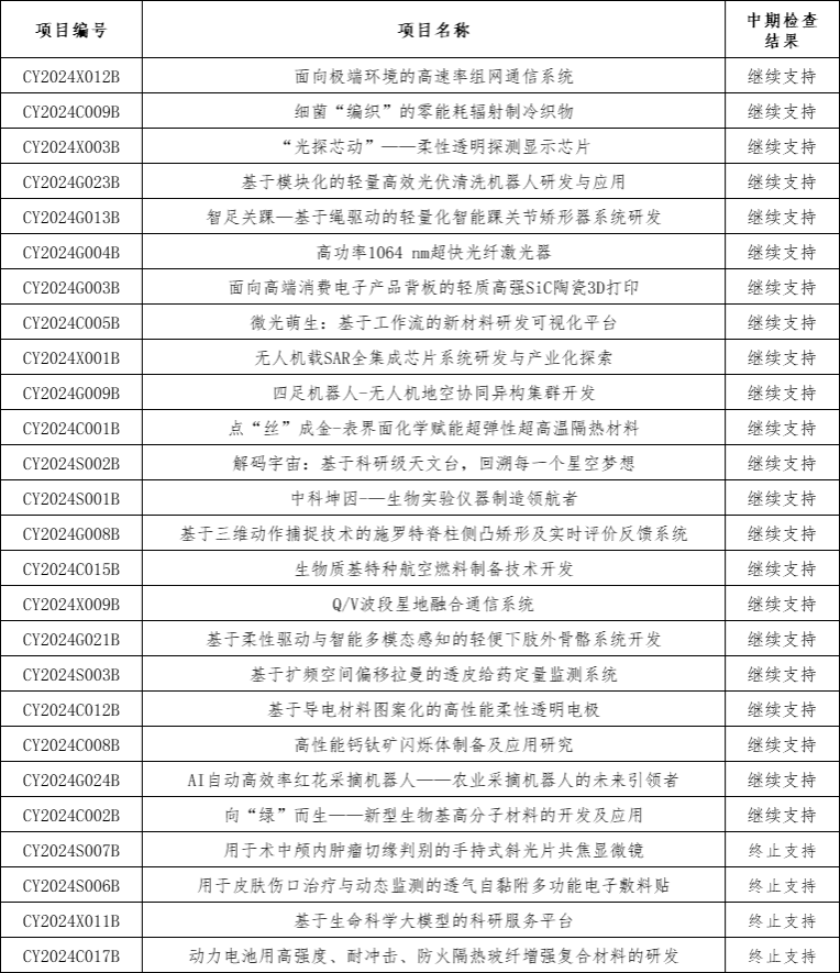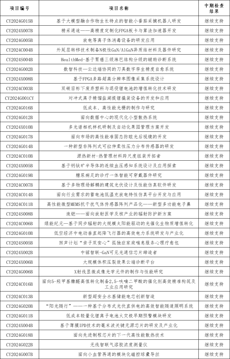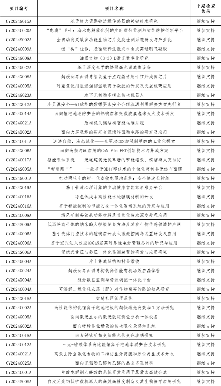 按照工作安排,根据《关于开展2024学年“雏鹰基金”、“雄鹰基金”中期检查的通知》要求,经材料提交、走访核实、二次复核及专家评审,确定“基于极大望远镜边缘传感器的关键技术研究”等136个“雏鹰基金”项目作为继续支持项目;确定“基于WGM微腔的窄线宽激光器研发与产业化”等37个“雄鹰基金”项目作为继续支持项目。现将中期检查结果公布如下:
