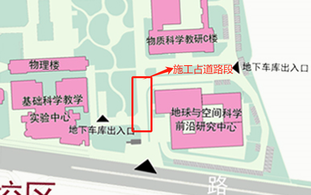施工车辆占道期间地球和空间科学前沿研究中心西侧道路(详见附图)车辆将无法通行,因此东区太湖路东南门在此期间仅供非机动车辆及行人通行,给师生员工带来不便,敬请谅解。