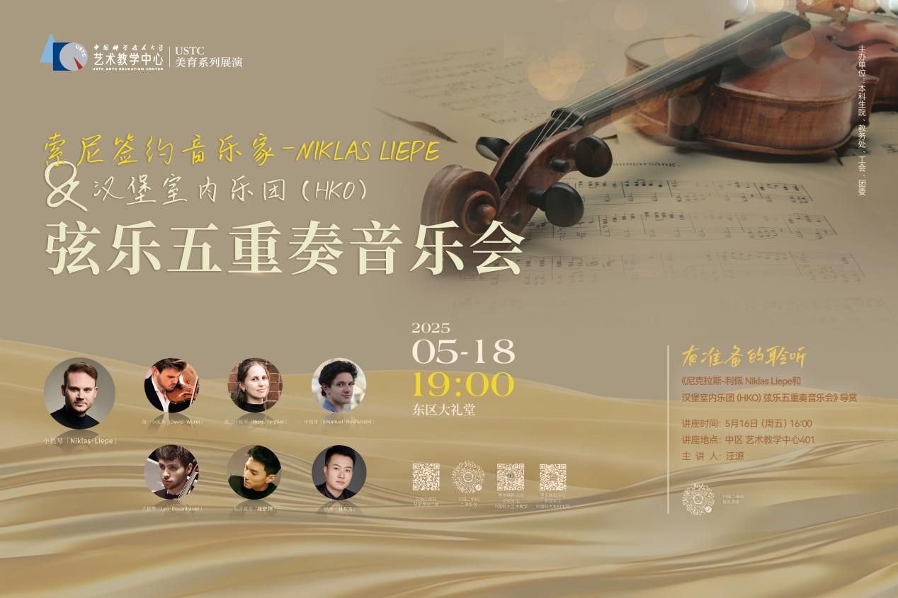 为丰富学校美育文化活动,本科生院、教务处、工会和团委主办的“USTC美育系列展演”之《尼克拉斯·利佩和汉堡室内乐团(HKO)弦乐五重奏音乐会》将于5月18日晚在校内举行。