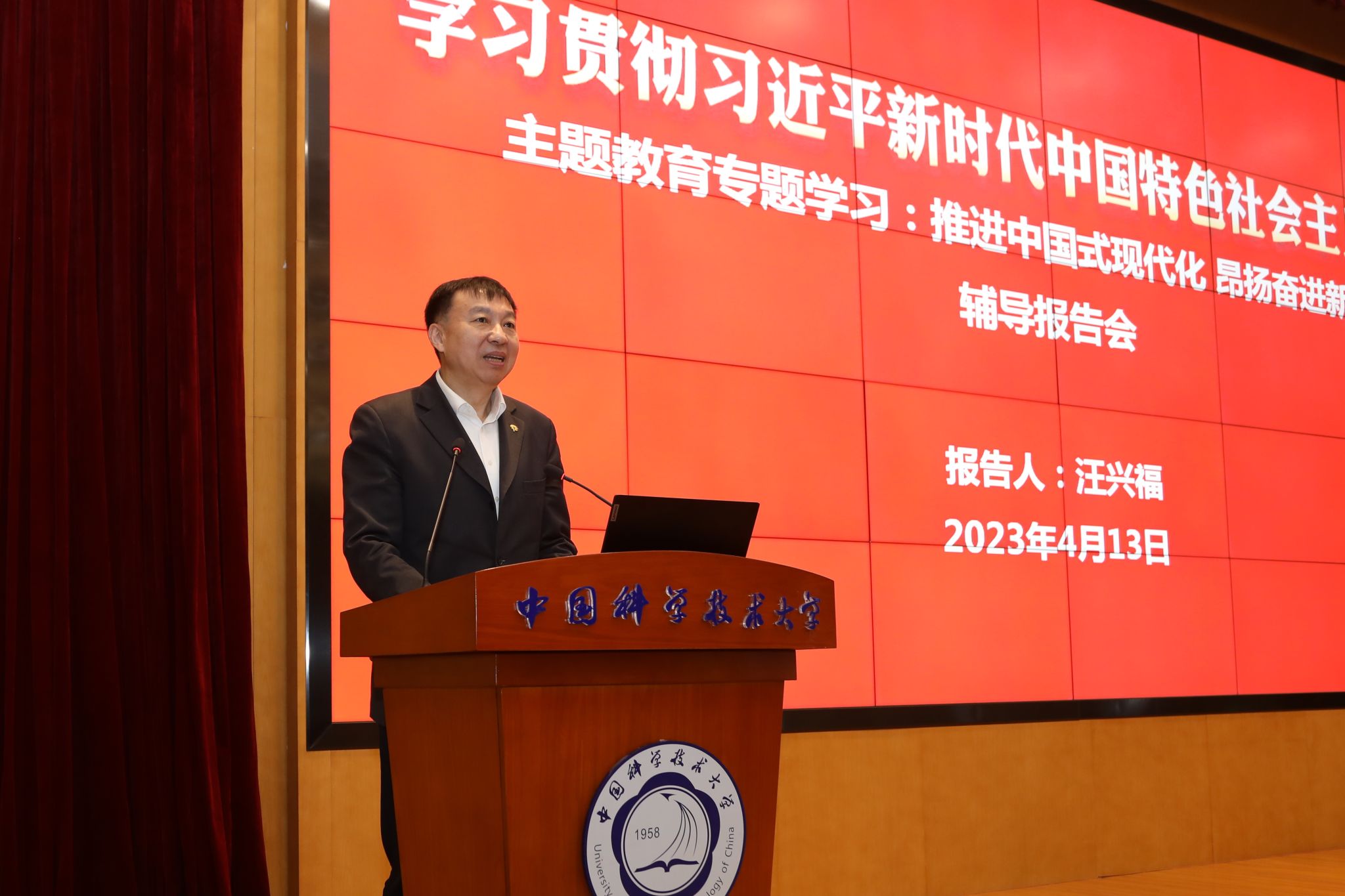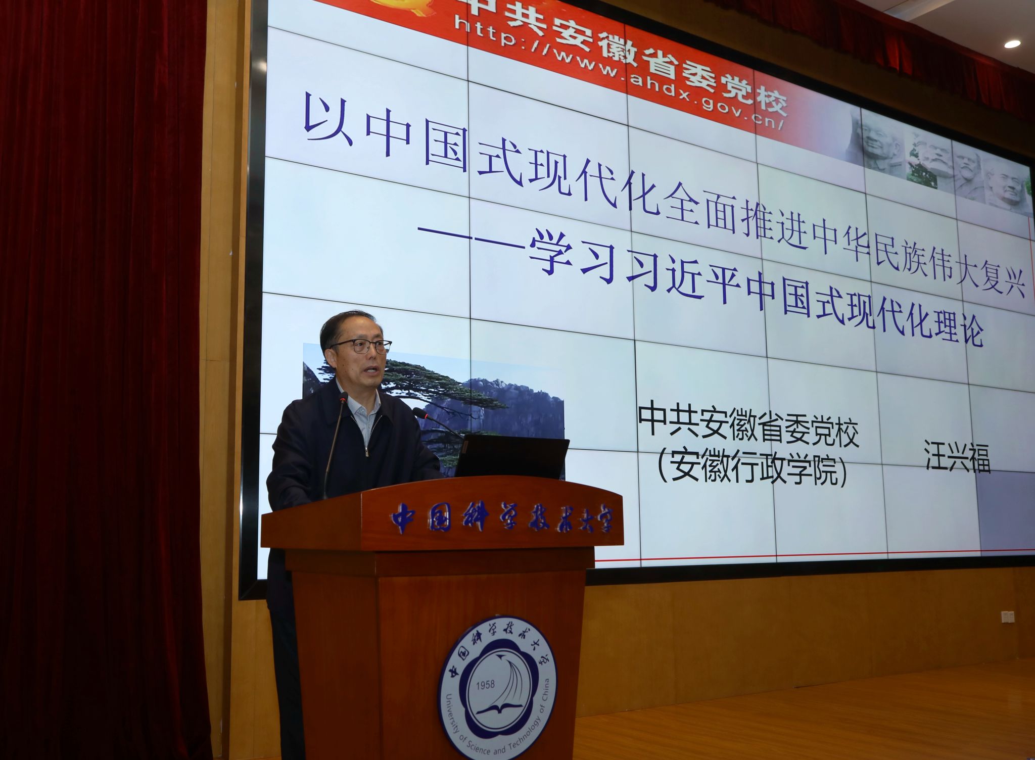 为深入开展学习贯彻习近平新时代中国特色社会主义思想主题教育,4月13日上午,乐鱼官网首页入口在东校区物质科研楼三楼报告厅,围绕“推进中国式现代化,昂扬奋进新时代”举行专题辅导报告会。中共安徽省委党校(安徽行政学院)马克思主义学院院长、教授、博士生导师汪兴福受邀作题为《以中国式现代化全面推进中华民族伟大复兴》的报告。报告会由校党委书记舒歌群主持。