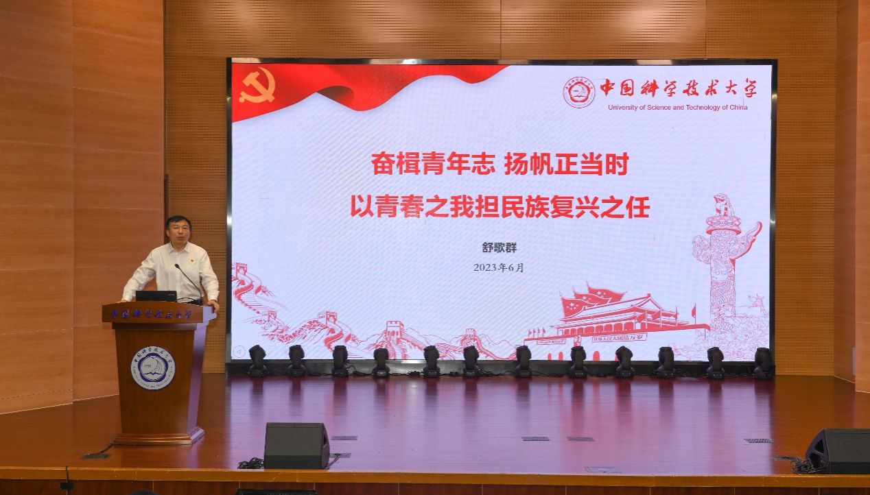 随后,舒歌群从“坚定科技强国信心”“传承红色科大精神”“接续民族复兴伟业”三个方面展开,为同学们上了一节生动且深刻的思政课。通过一系列鲜活的案例,指出了科技创新事业的重要性,勉励同学们肩负起时代赋予的重任。向同学们介绍了钱学森、郭永怀、钱临照、杨承宗等老一辈科学家们的感人事迹,希望同学们能够传承“科教报国、追求卓越”的红色基因。