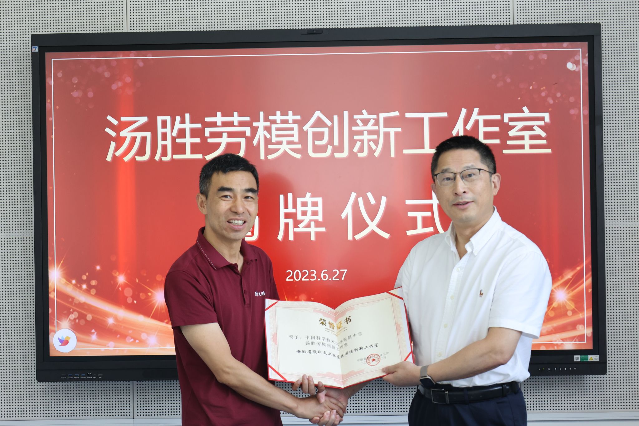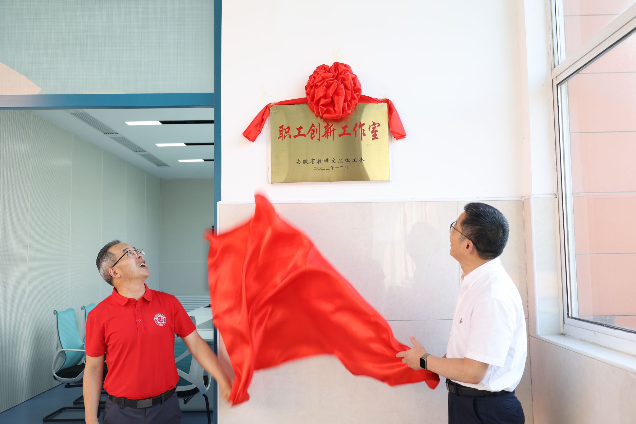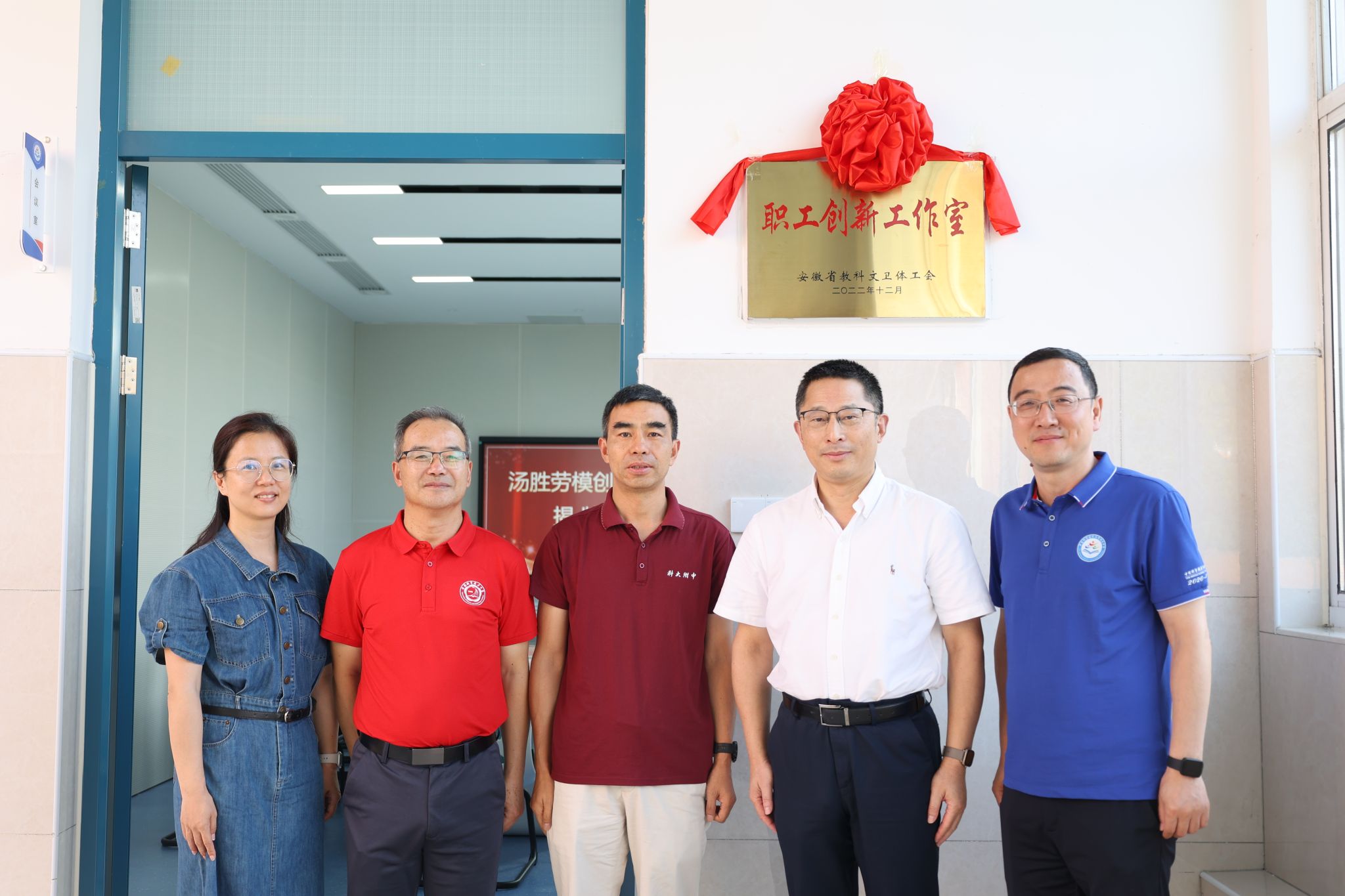 调研交流结束后,周丛照为汤胜颁发了“安徽省教科文卫体系劳模创新工作室”荣誉证书,周丛照、杨定武、马运生共同为“汤胜劳模创新工作室”揭牌。“劳模创新工作室”是全国总工会、省总工会和省教科文卫体工会探索创新服务发展大局推出的一个新平台、新载体,主要围绕创新驱动发展战略,进一步发挥人才培养、项目攻关、科技创新、团队协作的示范和引领作用,培养高技能专业人才、高素质知名专家,为推动我省经济社会高质量发展做出更大贡献。