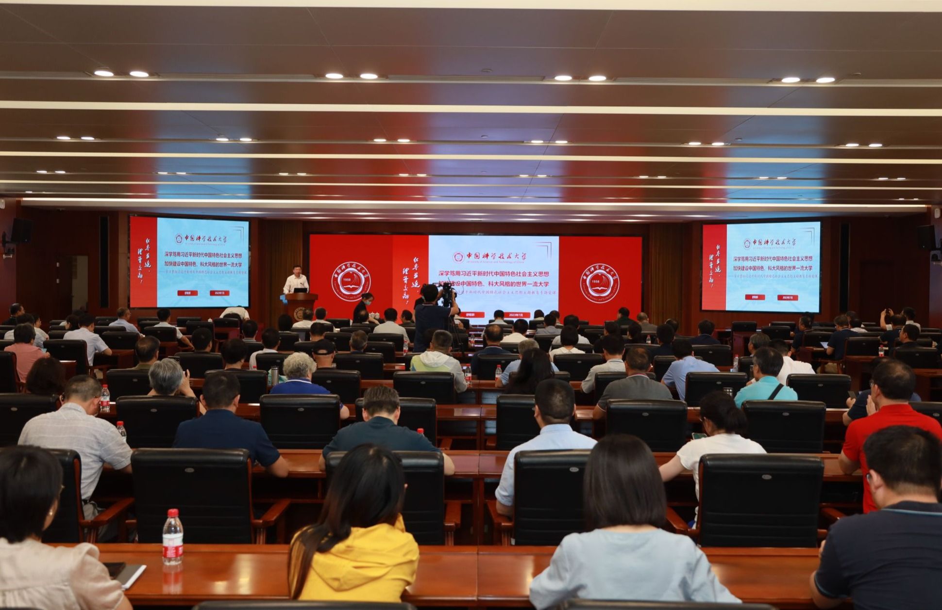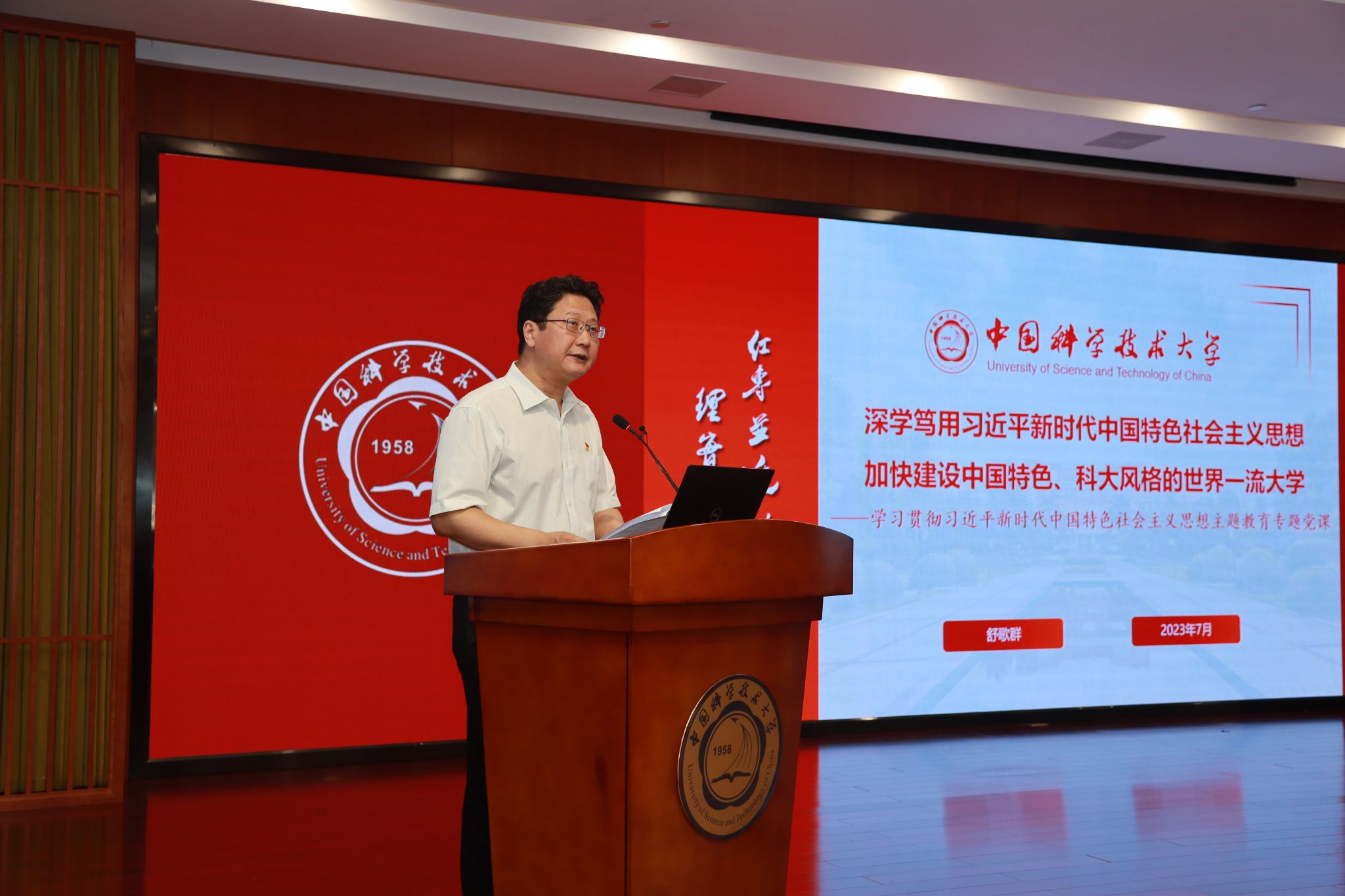 7月5日下午,我校学习贯彻习近平新时代中国特色社会主义思想主题教育专题党课报告会在东活五楼报告厅举行。校党委书记舒歌群作题为《深学笃用习近平新时代中国特色社会主义思想 加快建设中国特色、科大风格的世界一流大学》的专题党课报告。中央第五十四指导组组长、中国人民大学原党委书记靳诺,指导组成员、教育部宣传教育中心技术处副处长赵冬玲等同志到会指导。在校校领导,全体中层领导干部,基层党支部书记、师生党员代表参加学习。党课由校党委常务副书记蒋一主持。