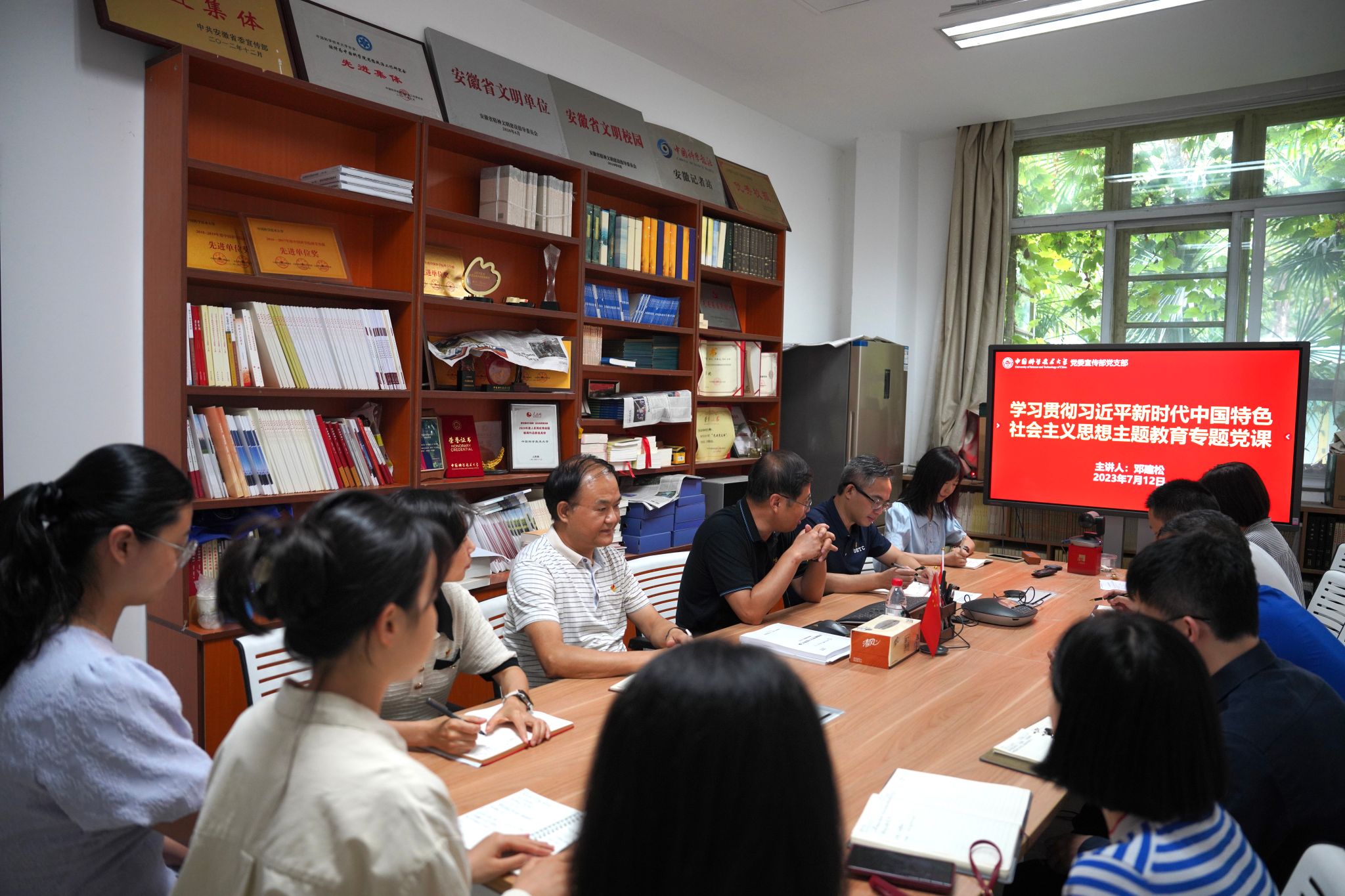 为深入学习领悟习近平新时代中国特色社会主义思想的真理力量和实践伟力,进一步学习贯彻党的二十大精神,7月12日下午,校党委副书记、宣传部部长、主题教育第六指导组组长邓建松在218楼103策划室作题为《筑牢新时代高校意识形态工作前沿阵地》的主题教育专题党课报告。宣传部党支部书记朱霁平主持报告,支部全体成员参加学习。