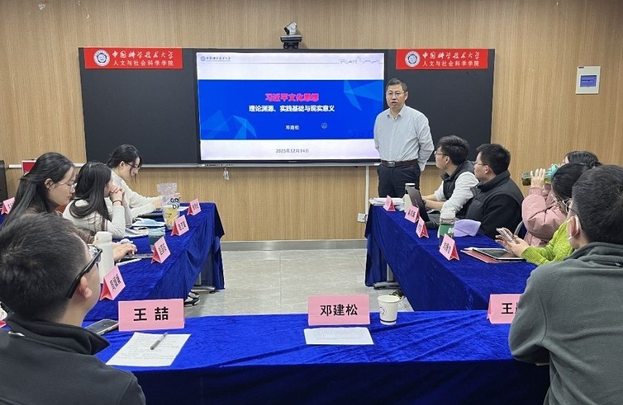 12月14日晚,校党委副书记邓建松于南区人文学院以学习习近平文化思想为主题,为科技哲学系研究生党支部上专题党课并参加党支部12月份支部大会。本次会议由科技哲学系研究生党支部书记时仪主持,支部党员、发展对象、积极分子和近期递交入党申请书的同学参加本次会议。