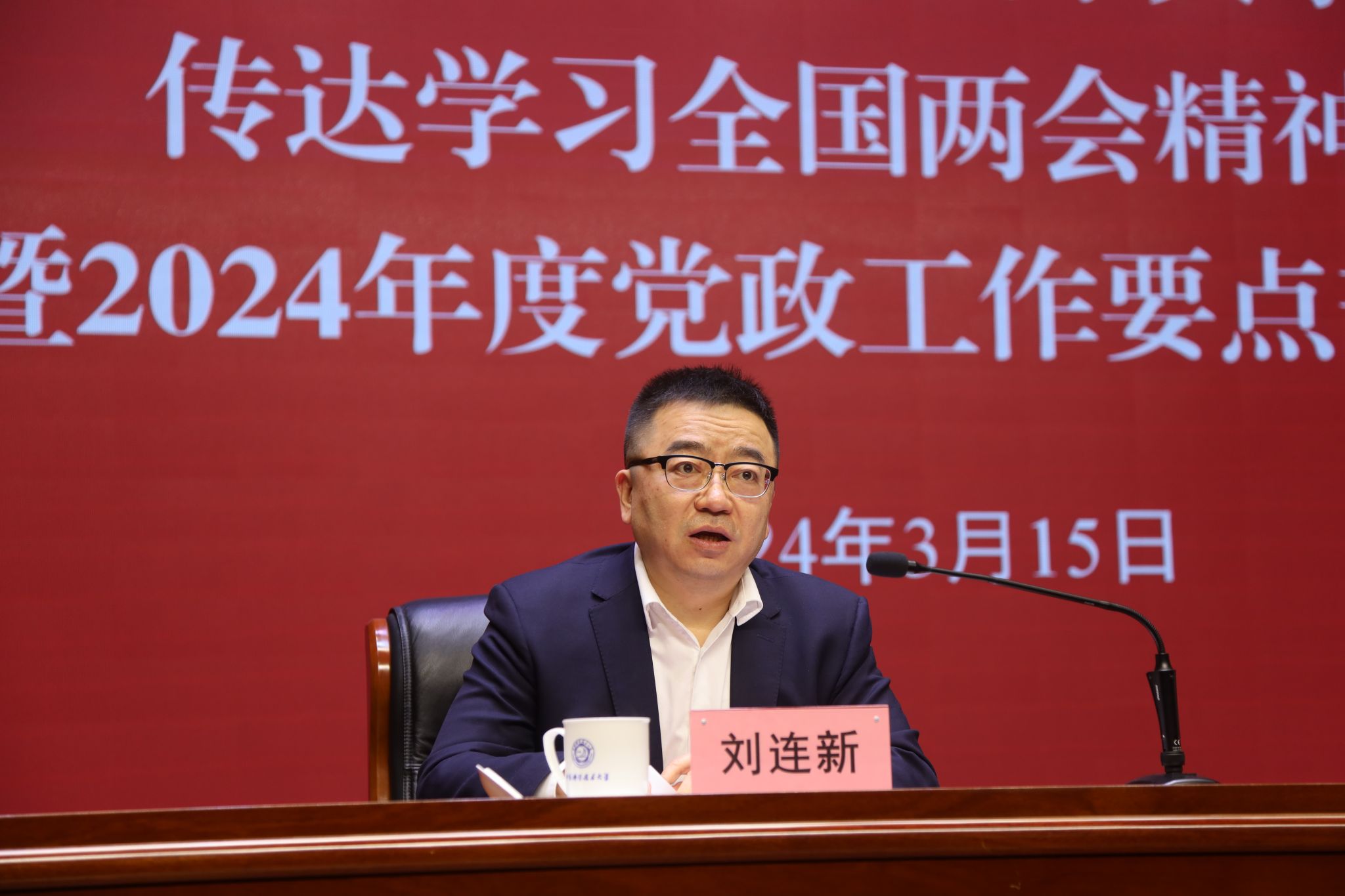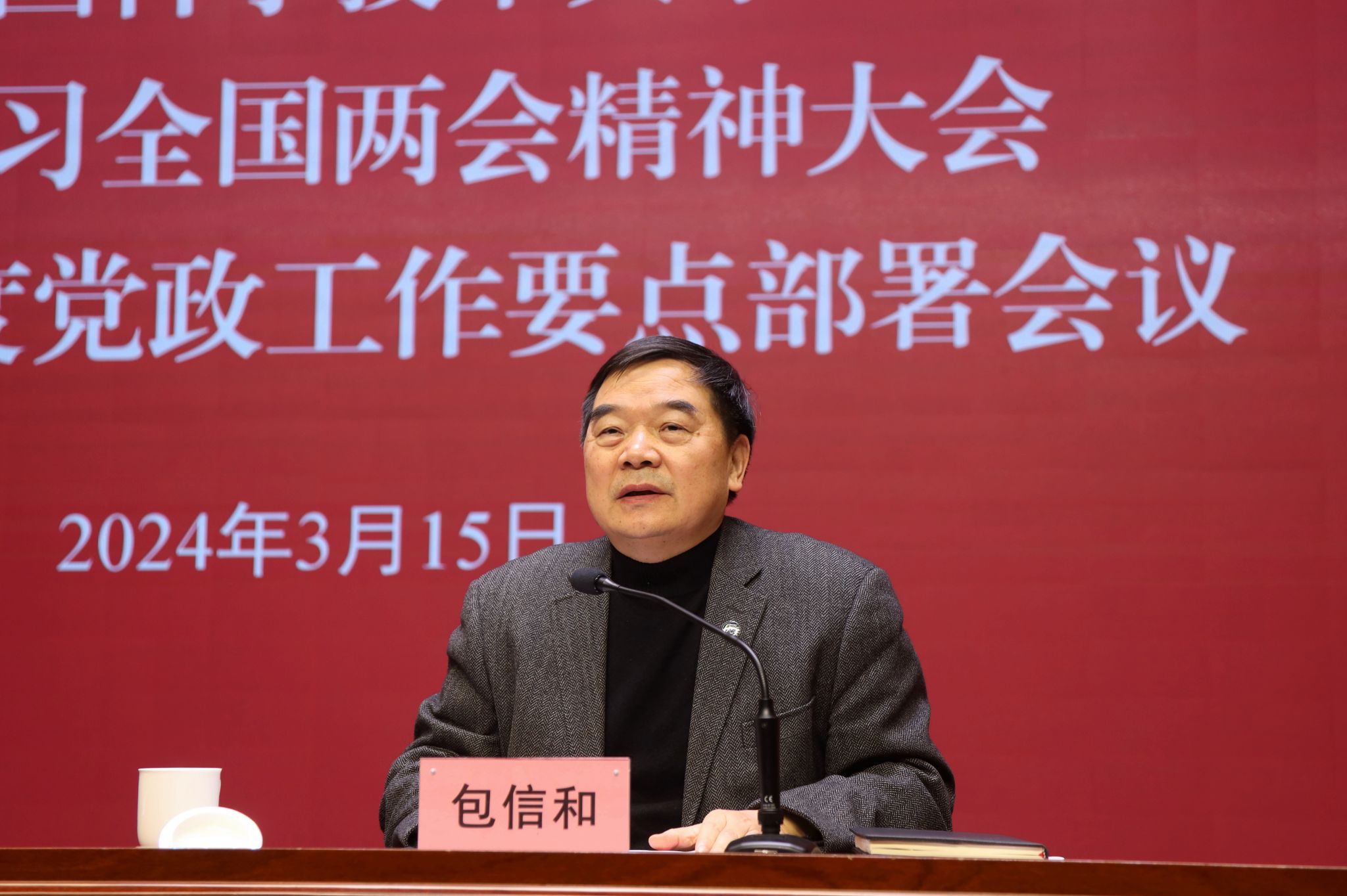 包信和指出,今年是中华人民共和国建立75周年,也是实现“十四五”规划目标任务的关键一年。学校要深入学习贯彻落实全国两会精神,牢牢把握高质量发展这个首要任务,聚焦“潜心立德树人、执着攻关创新”两大核心任务,坚持教育、科技、人才一体统筹推进,强化国家战略科技力量的责任担当,充分依托中国科学院发挥“全院办校、所系结合”特色优势,加强校地合作,积极融入长三角区域一体化发展和国家科教融合发展战略,因地制宜发展新质生产力,为加快推进教育强国、科技强国、人才强国建设贡献中国科大力量。