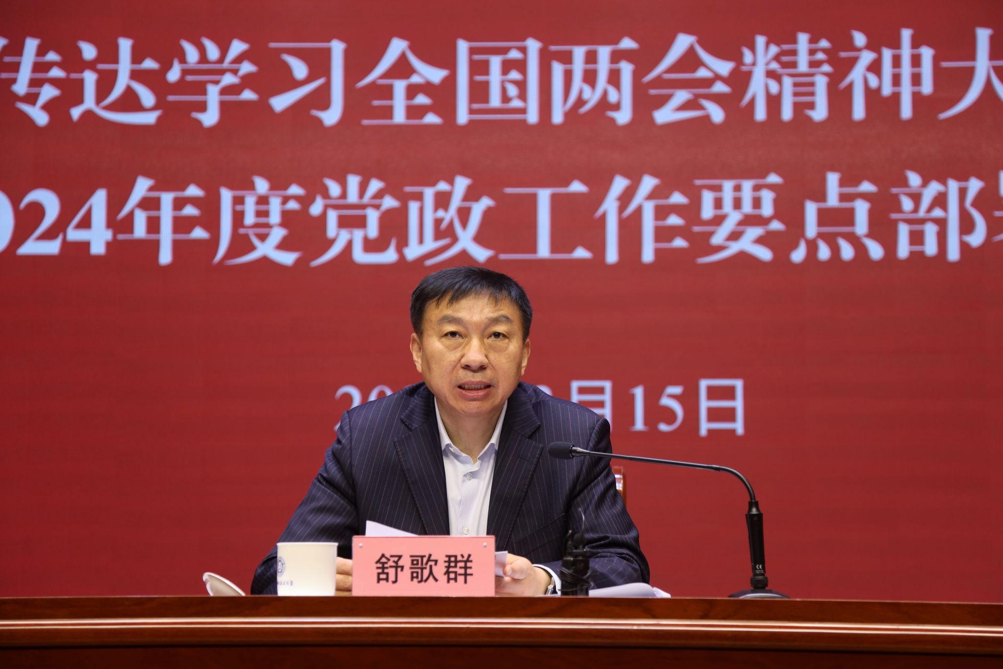 舒歌群指出,要把准重点方向,结合年度工作要点扎实落实全国两会各项部署,牢牢把握推动高质量发展这个首要任务,深刻领会因地制宜发展新质生产力这一重大论断,在推进“十四五”规划实施和“十五五”规划预研工作中全方位落实习近平总书记关于深化科技体制、教育体制、人才体制等改革的重要指示精神,着力破除教育、科技、人才等创新要素自由流动的体制机制障碍,打通束缚新质生产力发展的堵点卡点。全体党员干部要进一步提振干事创业的精气神,巩固拓展主题教育成果,锐意改革创新、敢于善于斗争,在直面问题、破解难题中不断打开工作新局面。全校科技工作者要进一步增强科教兴国强国的抱负,担当起科技创新的重任,坚持“四个面向”,加强基础研究和应用基础研究,把论文写在祖国大地上,把科技成果应用在强国建设、民族复兴的伟大事业中。