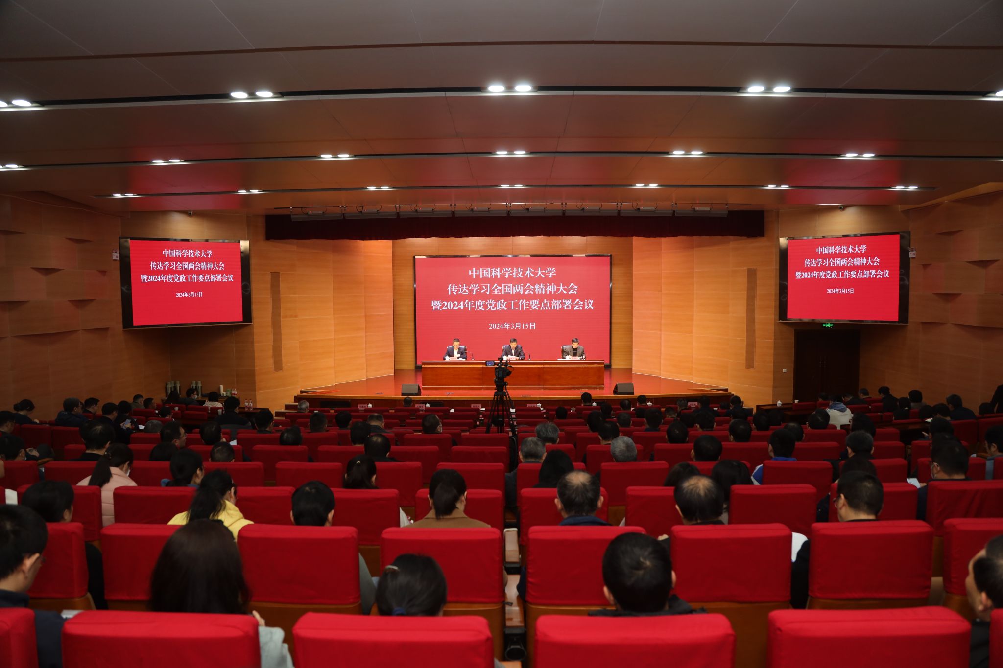 3月15日上午,乐鱼官网首页入口全国两会精神传达学习会暨2024年度党政工作要点部署会议在东区水上报告厅举行。校党委书记舒歌群主持会议并传达习近平总书记在全国两会期间的重要讲话精神。全国人大常委会委员、校长包信和传达十四届全国人大二次会议精神并介绍安徽代表团参会情况,全国政协委员、附属第一医院(安徽省立医院)党委书记刘连新传达全国政协十四届二次会议精神并介绍住皖全国政协委员履职尽责、提交提案等情况。在校校领导,两院院士,校党委、纪委委员,全体中层干部,各民主党派负责人,教师代表,学生代表参加会议。