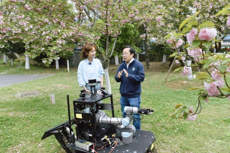 与美景相约,与科技牵手,春光中的自然课堂上,中国科大工程科学学院副院长张世武教授带领大家一睹“撼地者”机器人的风采。举起“手”,它轻轻触碰了枝头绽放的花朵;开足马力,它轻松推动了百斤重的石墩,这位“全能战士”现场展示出了动作的精巧与行动的敏捷。