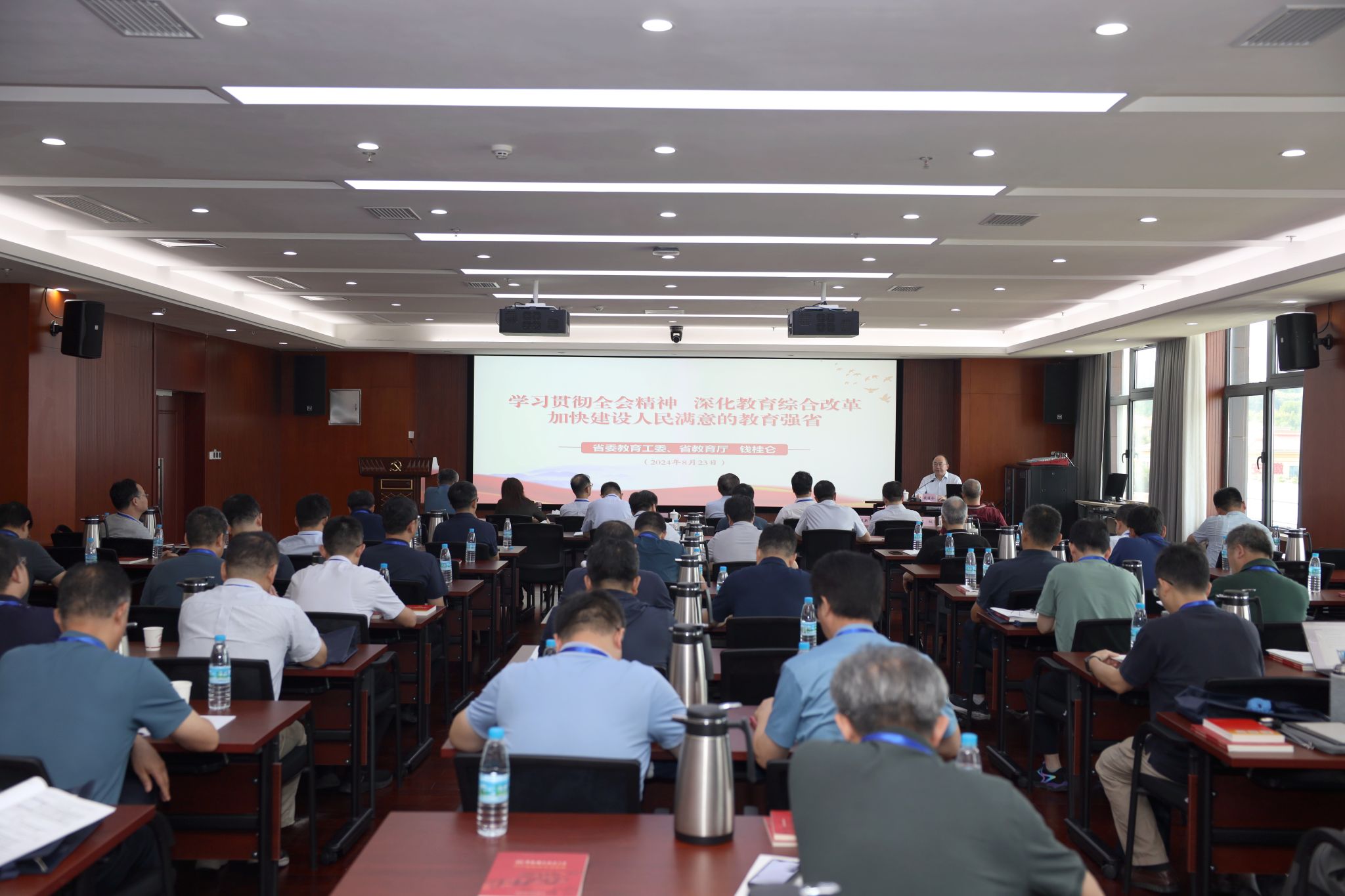 8月23日下午,校党委理论学习中心组集中学习(扩大)会暨专题党课报告会在蚌埠市委党校举行。安徽省委教育工委书记、省教育厅厅长钱桂仑以《学习贯彻全会精神 深化教育综合改革 加快建设人民满意的教育强省》为题,为我校领导干部作专题党课报告。校党委书记舒歌群主持报告会,校领导蒋一、王晓平、刘连新、刘浏、吴枫、薛天、汪毓明、王伟、申成龙参加报告会。