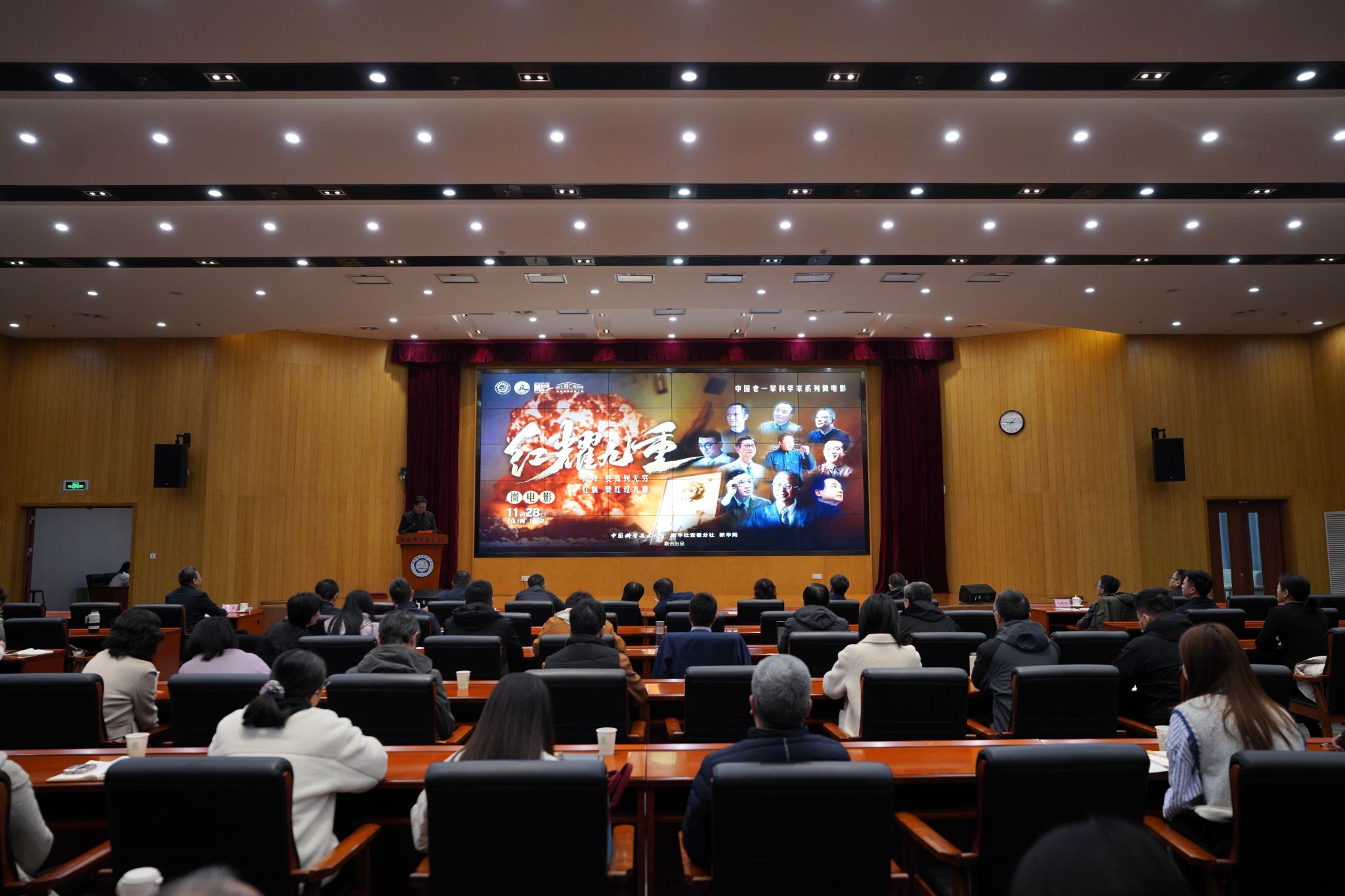 自2019年起,学校联合新华社安徽分社、新华网,先后制作了《永怀初心》《月是故乡明》《科学之光》《永恒的东风》《科学的春天》《人民的数学家》6部微电影作品,多次荣获国际国内微电影奖项,入选科学家精神电影全国科普场馆巡映,获得了良好的社会反响。《红耀九重》是系列微电影中的第7部。现场,《红耀九重》进行了首映。
