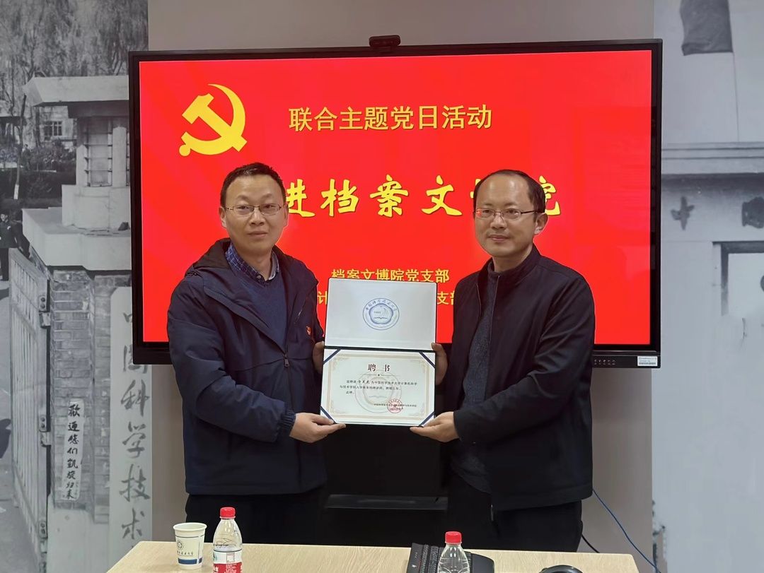 共建活动中,徐宏力向档案文博院执行院长方黑虎颁发了“入学教育特聘讲师”聘任证书。计算机学院一直注重加强思政教育的顶层设计,积极拓展学工队伍内涵,聘请政治思想过硬、管理经验丰富、热心教育事业的校内外企业家、学者等担任学院“企业家辅导员”、“入学教育特聘讲师”等,本年度聘请方黑虎为学院“入学教育特聘讲师”,将进一步加强对学院师生党史、校史、科大精神及科学家精神的学习教育和传承发扬,切实增强学院师生的历史使命感,社会责任感和民族自豪感。