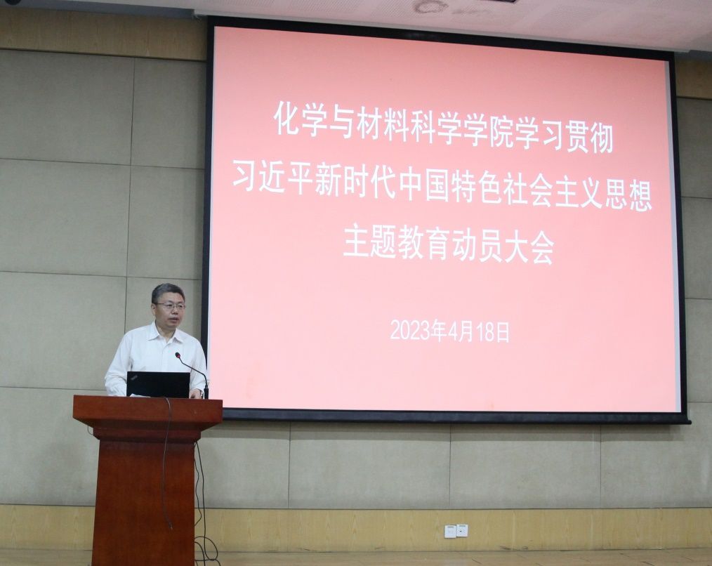 4月18日下午,化学与材料科学学院学习贯彻习近平新时代中国特色社会主义思想主题教育动员大会在环资楼学术报告厅召开。化学与材料科学学院党委书记闫立峰主持会议并作动员讲话。学校主题教育第六指导组组长、校党委副书记、党委宣传部部长邓建松到会指导。学院领导班子成员、党委委员、师生党支部书记及党员代表共同参加会议。