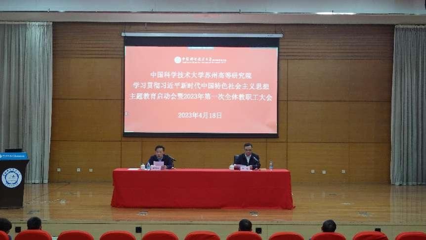 4月18日下午,苏州高等研究院在唯真楼一楼报告厅召开学习贯彻习近平新时代中国特色社会主义思想主题教育启动大会暨2023年度第一次全体教职工大会。会议由高研院党委常务副书记屠兢主持,学校主题教育第七指导组组长、校党委常委褚家如出席会议并作指导讲话。高研院党政班子成员、院内各单位教职工、师生党支部书记、学生党员代表参加会议。