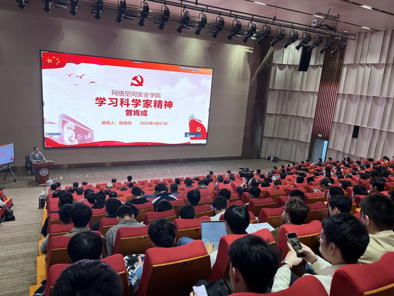 4月27日下午,网络空间安全学院围绕“坚定理想信念,传承科学家精神”主题,在高新区图书馆C座GT-C103开展学习贯彻习近平新时代中国特色社会主义思想主题教育第一次专题学习会暨学习“科学家精神”系列讲座。中国科学院软件研究所副主任研究员苏璞睿、副研究员程亮、网络空间安全学院党总支书记谭勇、执行院长俞能海、副院长张卫明、学院各党支部书记、支委、党员代表,以及400余名学生参加主题教育和讲座。