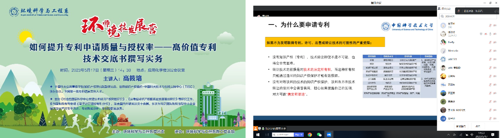 公共事务学院/知识产权研究院副研究员高筱培受邀作题为《如何提升专利申请质量与授权率——高价值专利技术交底书撰写实务》的分享报告。高筱培从专利申请缘由、专利获批条件、专利申请流程、技术交底书撰写与提升专利申请质量五个方面展开介绍,用通俗易懂的语言全方位讲解了专利撰写与申请的核心要点,参会教师均表示受益匪浅。此次报告亦是环境科学与工程系“‘环’师‘境’技发展营”的第三场讲座,报告结束后,环境科学与工程系教工党支部书记盛国平为高筱培赠送了“‘环’师‘境’技发展营”嘉宾奖牌,对其精彩生动的报告表示由衷感谢。