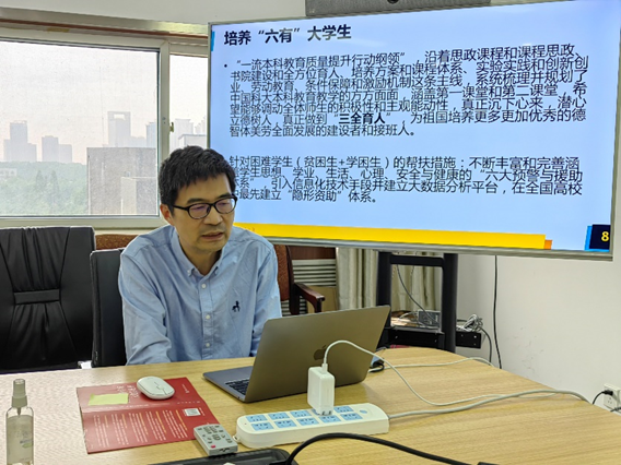 副院长孙广中领学了专题“潜心立德树人,培养‘六有’大学生”。孙广中结合专题学习内容,介绍了我校近年来在培养“六有”大学生方面开展的一系列措施,以及取得的工作进展和成绩。同时围绕“潜心立德树人”核心任务,联系学院具体工作任务和专题调研情况,重点汇报了个人学习体会和工作计划,表达了向“四有”好老师看齐,向“三为”大先生努力的意愿。