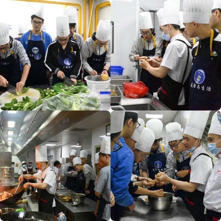 柴米油盐酱醋糖,调出万千美味;蒸煮炒焖爆炸煎,烹出百种佳肴。在食堂厨师带领下,有的同学洗菜切菜动作麻利,干脆利索,也有同学尽管是第一次接触,也勇敢上手尝试斩鸡块、挑虾线,锅铲锅勺上下翻动,游刃有余。同学们在培训中了解了营养学基本知识,熟悉部分食材特性,完成食品原料从择、洗、切、烧到成品的全过程。大家分别学习完成了清蒸鲈鱼、红烧狮子头、白灼基围虾、红烧鸡块、回锅肉等10道家常菜的加工制作。