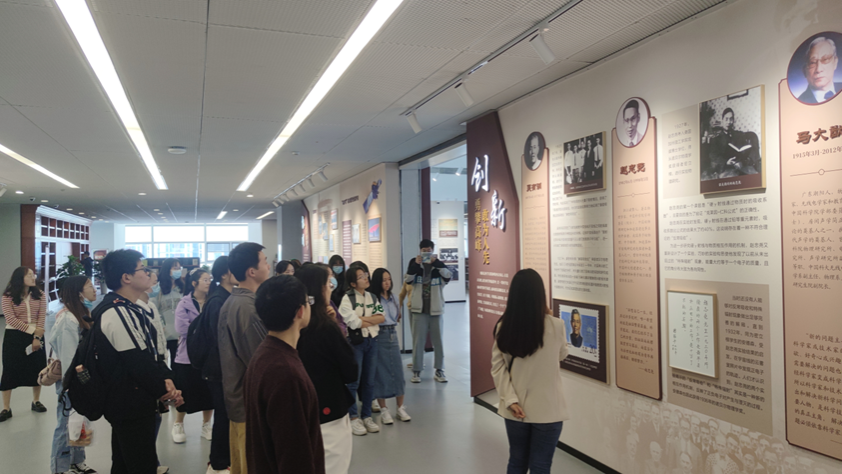 中国科大是一所具有科学家精神传承的红色大学,在讲解员的讲解下,同学们重温了中国科大从无到有的发展历程。在那样艰苦的年代,中国科大从1958年6月2日中央批准创办,到9月20日举行成立大会暨开学典礼仅用了111天,这样的速度让大家无不感叹老一辈科学家们科教报国、创新立校的决心和勇气。在“爱国”展厅前,从郭沫若先生弃医从文,扛起科大建校大旗,到郭永怀烈士用生命之火点燃科学之光,从“人民数学家”华罗庚穷理致知,反躬践实探索数学之巅,再到“两弹一星”元勋钱学森毅然回国,投身中国航天事业,大家看到的是老一辈科学家们穷尽一生只为祖国的繁荣昌盛,感受到的是他们发自内心的无私爱国之情。在一张张珍贵的老照片和一份份科学家手稿当中,同学们深切感受到贝时璋、程开甲、夏培肃等老一辈科学家们如何用实际行动践行“爱国、创新、求实、奉献、协同和育人”的理念。