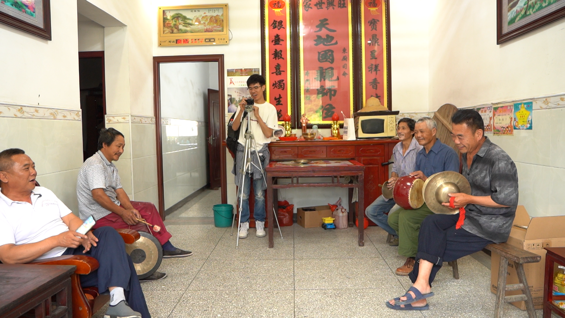 村民自发组织的花鼓队即兴创编一段花鼓戏表演