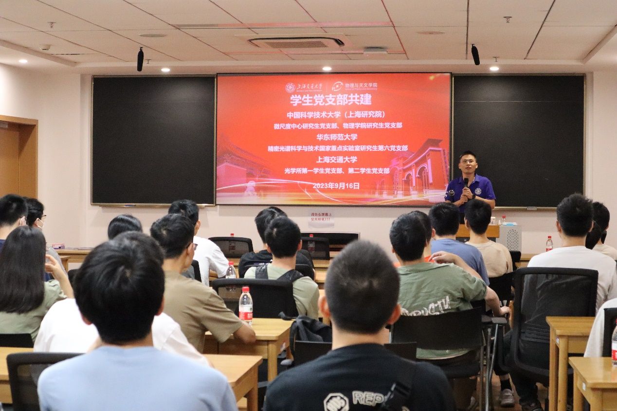 为深入学习贯彻习近平新时代中国特色社会主义思想,扎实推动主题教育走深走实,进一步加强研究生党建工作交流,2023年9月16日,我院微尺度中心研究生党支部、物理学院研究生党支部与上海交通大学物理与天文学院光学所第一学生党支部、第二学生党支部以及华东师范大学精密光谱科学与技术国家重点实验室研究所第四党支部、第六党支部,联合开展了主题为“党建聚合力,融合促发展”的支部共建活动。本次活动旨在为在院同学提供与其他在沪高校同学交流探讨的机会,同时促进相关科研领域的合作,本次活动共有来自三校约60名同学参加。