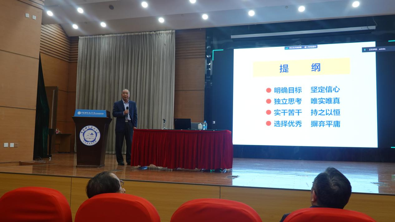 随后,中国科大化学系教授、博士生导师、科大老科学家报告团成员郭庆祥教授作主题报告分享。郭庆祥以《“科技与人文”的思考——选择优秀》为题,从“明确目标坚定信心、独立思考唯实唯真、实干苦干持之以恒、选择优秀摒弃平庸”四个层次鼓励和引导广大师生树立正确的价值理念和奋斗目标,遵循和运用正确、科学的路径和方法,传承弘扬“两弹一星”精神和老一辈科学家精神,接续奋斗、勇于创新、力争一流。