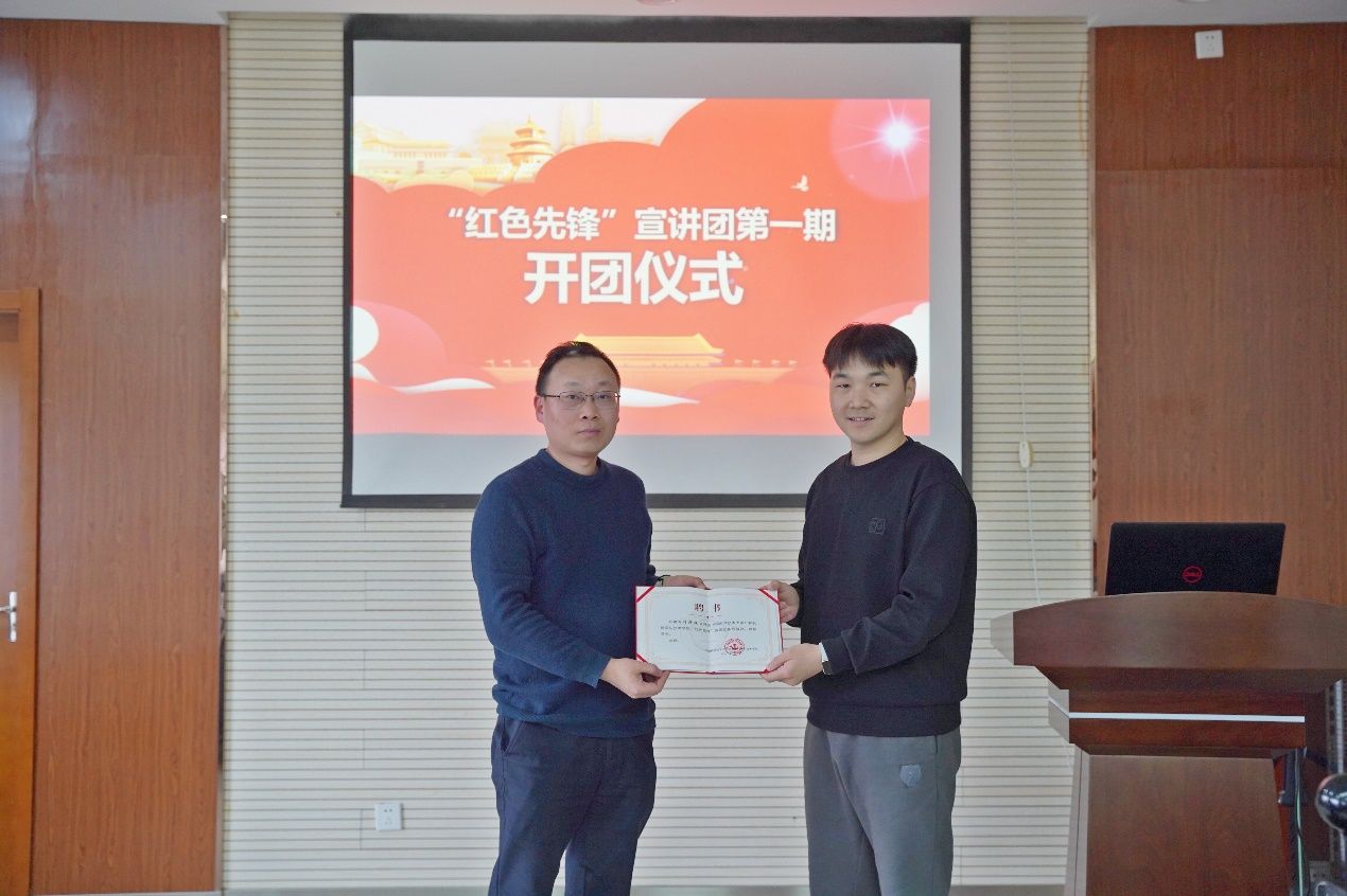 随后,徐宏力为宣讲团指导教师陈海超颁发了聘书。陈海超是我校马克思主义学院的青年教师,知识理论丰富,业务水平强,在指导宣讲团同学选题、打磨宣讲内容、传授授课方法等方面付出了大量精力。他在发言中表示,“红色先锋宣讲团”是在计算机学院党委领导下,学生党支部推动党建高质量发展、提升理论学习水平的创新之举,是学生党员自我学习、自我教育、自我培养的重要形式,具有“青年感染青年”的重要作用。他作为指导教师指出,经过长时间的选题、制作课件、打磨讲稿等,各个专题的宣讲团队已经初具授课条件,希望相关主讲党员和支部做好后续宣讲准备,在实践中不断提升宣讲水平,为党员教育培养和学院党建做出应有的贡献。