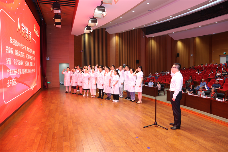 刘连新随后向老党员代表颁授“光荣在党50年”纪念章。广大老党员离岗不离党、退休不褪色,为党的革命事业和卫生健康事业奋斗终身,为新时代党员干部树立了光辉榜样。在鲜红神圣的党旗下,新党员代表在刘连新的带领下庄严宣誓。新党员代表、妇产科主治医师徐汉杰分享了入党的心路历程,表达了对党的真挚感情。徐汉杰表示,将牢记入党初心,铭记党员使命,以实际行动践行入党誓词。