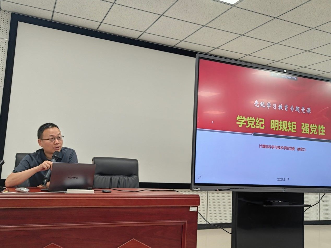 6月17日上午,计算机科学与技术学院党委于高新校区一号学科楼214会议室举行预备党员入党宣誓仪式暨“学党纪、明规矩、强党性”党纪学习教育专题党课。院党委书记兼副院长徐宏力教授、党委副书记宫晓梅老师出席。活动由学院党建办任开新老师主持,学院新发展的预备党员同志共同参与。