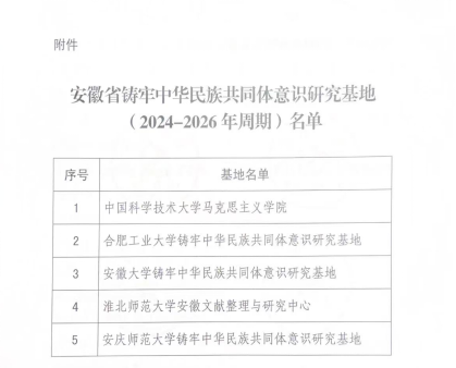 近日,中共安徽省委统一战线工作部、中共安徽省委宣传部、安徽省教育厅、安徽省民族宗教事务委员会联合印发《关于公布安徽省铸牢中华民族共同体意识研究基地(2024-2026年周期)名单的通知》,乐鱼官网首页入口马克思主义学院申报的安徽省铸牢中华民族共同体意识研究基地获批立项。
