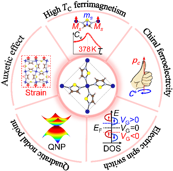 图1.二维Cr基五元杂环金属有机框架材料的拉涨效应、高温磁性、手性铁电、电场调控自旋极化和拓扑性