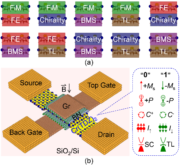 图2.二维Cr基五元杂环金属有机框架材料的亚铁磁性(FiM)、手性(Chirality)、铁电性(FE)、双极磁性(BMS)和拓扑性(TL)在近邻效应研究和高性能电子器件制备方面的优势