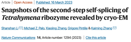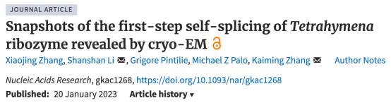 在许多生物体中,I型核酶通过两个连续的酯交换反应催化自身从RNA前体中切除。嗜热四膜虫I型核酶是第一个被发现的核酶,自20世纪80年代被发现以来,大量的生物化学和遗传学研究已经阐明了四膜虫核酶的潜在催化机制,但获得其全长分子的三维(3D)结构以及其催化功能所需的3D结构中的详细重排一直是重大的科学挑战。张凯铭等团队此前首次解析了四膜虫核酶的全长结构(Nature 2021),并解析了多个不同构象错误折叠的四膜虫核酶结构(PNAS 2022),为冷冻电镜解析高分辨率RNA结构做出了表率。