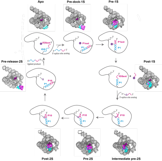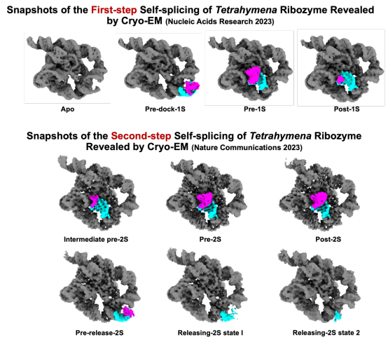图1.冷冻电镜解析四膜虫核酶两步自剪接过程中的多种不同构象。