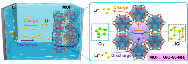 图1.Li-Cl2@MOF(UiO-66-NH2)二次电池及其正极Cl2/LiCl反应机理示意图。
