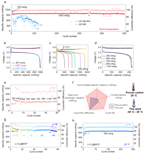 本工作提出在Li-Cl2电池中应用具有路易斯碱性官能团的多孔MOF来改善正极Cl2/LiCl的转化反应(图1)。在理论预测的指导下,利用第一性原理计算筛选出具有-NH2官能团的MOF应用在Li-Cl2电池中。冷冻透射电镜和低剂量高分辨透射电镜表征表明,UiO-66-NH2在循环过程中保持非常稳定的结构,XPS验证了-NH2基团对Cl2和LiCl的强亲和力,从而提高了其氧化还原反应动力学。论文中设计的Li-Cl2@MOF电池最高放电比容量可达2000 mAh/g,并在1000 mAh/g的比容量下稳定循环超过500次。同时,该Li-Cl2@MOF二次电池在低温-40 ℃下依然可以稳定工作(图2)。