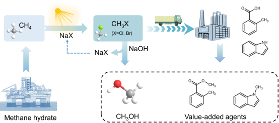 可燃冰是一种重要的储备能源,试采可燃冰的产品中99.5%成分是甲烷。据推断,在我国南海可燃冰的储量至少达800亿吨石油当量。目前可燃冰开采技术中的减压开采法,在可燃冰减压过程中会导致可燃冰气化,对甲烷气体的储存和运输将是一大考验。如能利用海上条件,将甲烷转化为高附加值的液态产品,将为可燃冰利用提供技术参考。熊宇杰研究团队针对甲烷的绿色可持续利用,开展了一系列的研究(J. Am. Chem. Soc. 2021, 143, 269;Angew. Chem. Int. Ed. 2021, 60, 9357;Research 2022, 9831340;Nat. Commun.2022, 13, 2806)。近日,熊宇杰/龙冉研究团队开发了一种绿色高效的光催化甲烷卤化技术,在仅利用光照、甲烷和海水的条件下进行卤代甲烷合成,进而以串联反应实现了甲醇和药物中间体的高效合成,发表在《自然×通讯》期刊(Nat. Commun. 2023, 14, 1410)。