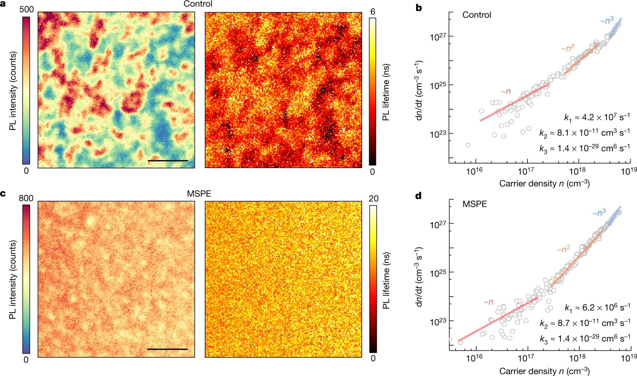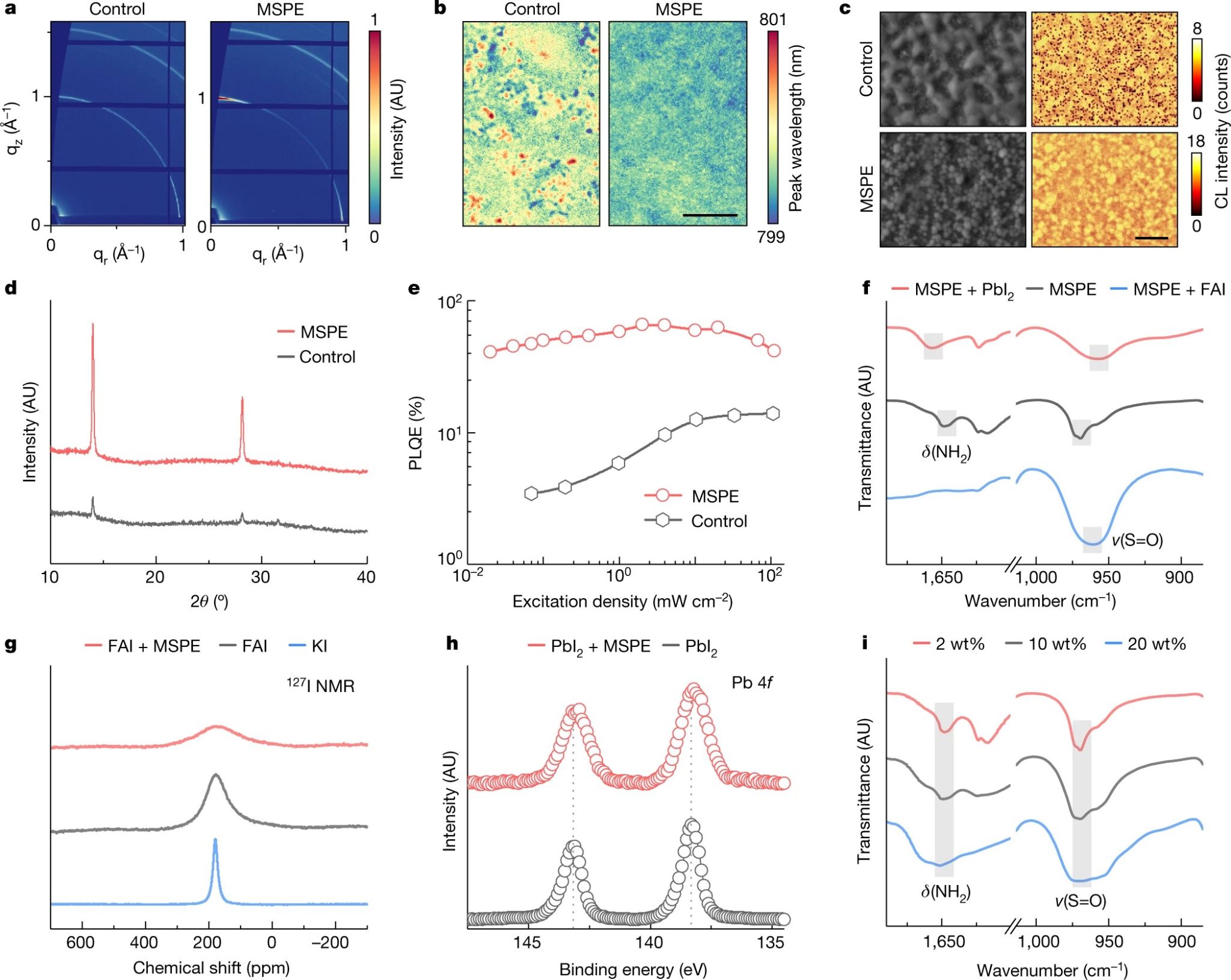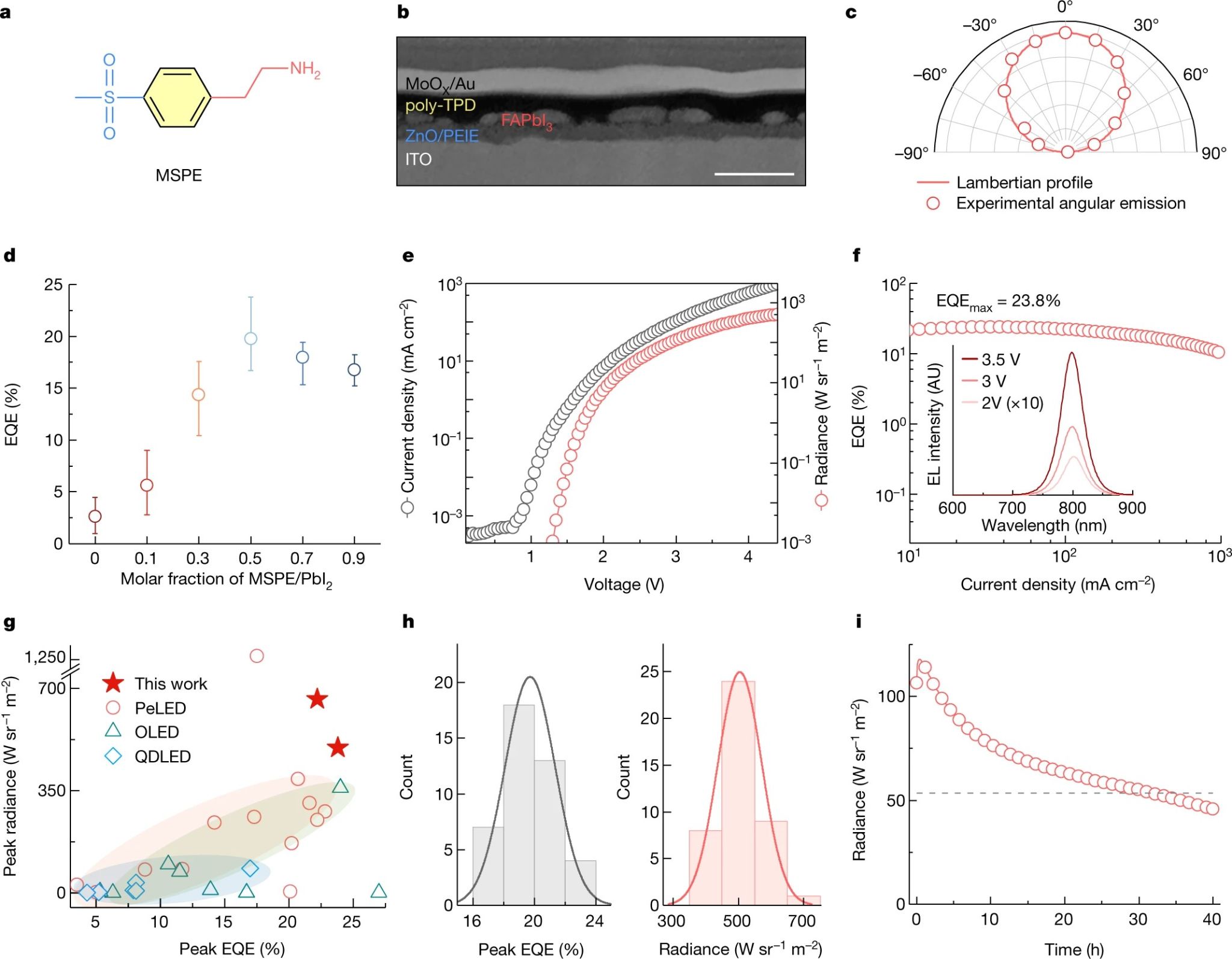 针对以上问题,团队设计开发了一种多功能分子稳定剂2-(4-甲砜基苯基)乙胺(MSPE)用来精准调控钙钛矿材料的光电性能、晶体行为和形态学性质,大幅提升钙钛矿LED在高亮度下的效率和稳定性(图一)。MSPE通过氢键和配位键与钙钛矿中的组分相互作用,有效调控钙钛矿的结晶生长过程,提高了薄膜的结晶性和晶粒的规整性(图二),并实现对钙钛矿表/界面缺陷有效钝化,大幅提升钙钛矿薄膜的发光效率和发光均一性(图三);另一方面,MSPE分子间通过氢键诱导形成自组装结构,抑制了传输层界面低能态的形成,消除了传输层界面对钙钛矿材料发光的淬灭(图四)。得益于MSPE对钙钛矿和传输层界面的协同钝化效应,实现了高亮度、高效率和高稳定性的近红外(~800 nm)钙钛矿LED。器件峰值EQE高达23.8%,并且在1000mA cm−2的电流密度下,器件的EQE仍能超过10%,表现了超高的效率稳定性。在脉冲工作模式下,当电流密度高达4000mA cm−2时,此时器件的EQE仍超过16%,并且亮度达到3,200 W s−1m−2。值得注意的是,在初始亮度为107 W s−1m−2下,器件的寿命可以达到32小时以上,是目前稳定性最好的钙钛矿LED器件之一,在当前EQE超过20%的近红外钙钛矿中处于领先水平。在高亮度下,实现高效稳定的钙钛矿LED是迈向商业化关键一步,并有望在未来进一步实现钙钛矿电泵浦激光器展示了巨大潜力。