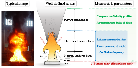 低动量凝聚相固体、液体以及气相可燃物火灾都可以称为“池火(pool fire)”,一直以来都是火灾和燃烧领域的重要基础科学问题之一,涉及到流体标量场混合输运、燃烧化学反应与热质传递的复杂耦合。十五年来,胡隆华研究员和方俊副研究员团队聚焦池火扩散燃烧与火灾动力学行为(图1),针对燃烧速率与热反馈机制、卷吸行为与火焰形貌特征参数、碳烟生成与火焰辐射的关键科学问题,开展了系统性的基础研究:揭示了环境风、低压等环境条件下池火热反馈主控机制转变、尺度效应以及燃烧速率的非线性演化规律[Combust. Flame 201 (2019) 93-103, 160 (2013) 295-306, 158 (2011) 586-91; Proc. Combust. Inst. 36 (2017) 3089-96, 35 (2015) 2511-18, 34 (2013) 2591-98.],量化表征了侧墙、顶棚等受限边界和开放空间条件下湍流扩散池火的卷吸差异机制[Proc. Combust. Inst. 38 (2021) 4505-13, 38 (2021) 4561-68, 37 (2019) 3879-87, 36 (2017) 2995-3002.],并建立了不同环境条件下火焰拉伸尺度与形态、边界层贴地行为、火焰不稳定性特征参数的表征模型 [Combust. Flame 205 (2019) 422-33, 162 (2015) 1095-103; Proc. Combust. Inst. In press: 10.1016/j.proci.2022.09.038, 36 (2017) 3105-12, 36 (2017) 2979-86.], 揭示了环境风、低压条件下池火烟点、碳黑体积分数与火焰近/远场辐射特性演变规律,构建了池火辐射分数理论模型 [Combust. Flame 202 (2019) 243-51; Fire Saf. J. 112 (2020) 102949; Fuel 245 (2019) 247-52.]。针对池火扩散燃烧和火灾动力学行为,胡隆华研究员与方俊副研究员已在国际燃烧领域两大知名期刊Combustion and Flame和Proceedings of the Combustion Institute发表论文24篇,胡隆华研究员受邀在第12届国际火灾安全科学大会(2017,IAFSS)、第8届火灾和爆炸危害国际学术会议(2016,ISFEH)作大会报告。