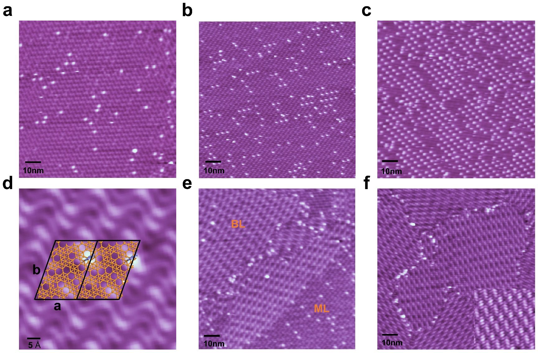 图2.单层硼烯表面上硼团簇覆盖度增加及其向双层硼烯结构演变的STM图像。