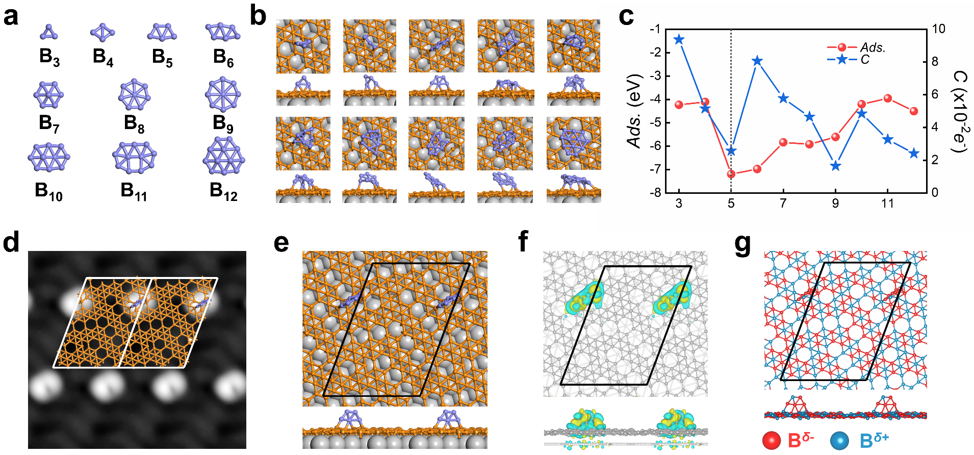 图3. 不同硼团簇(Bn)的原子结构以及在单层硼烯上吸附分布;B5团簇吸附在单层硼烯上的STM模拟图,结构图以及电荷分布