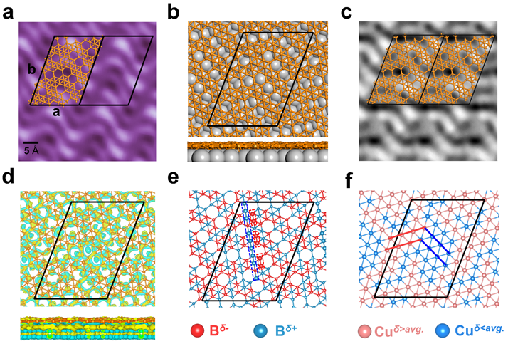 图1.铜表面单层硼烯的STM形貌图,原子结构图,STM模拟图;铜表面单层硼烯电荷分布的理论模拟。