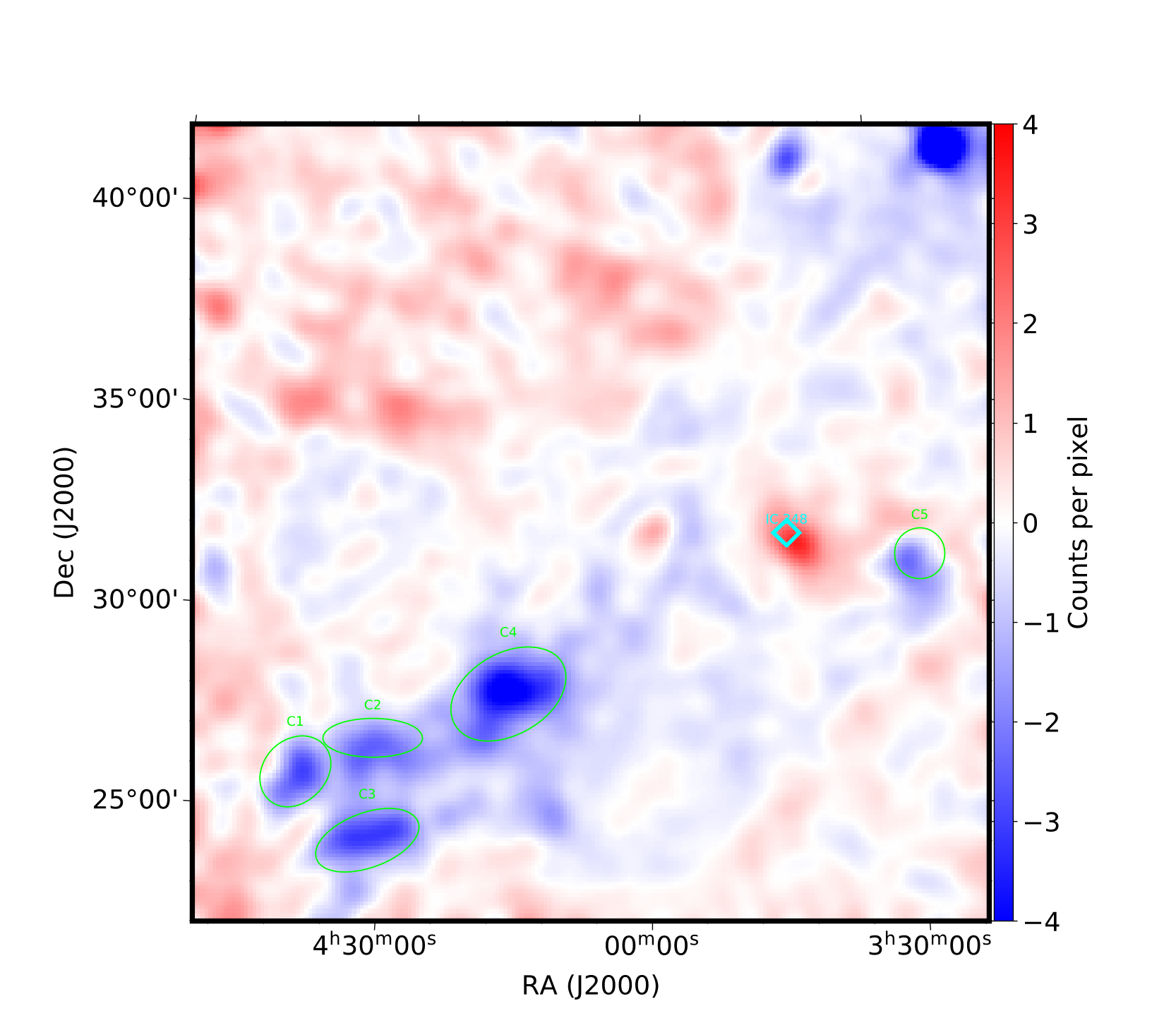 图一: 巨分子云Taurus和Perseus区域以气体柱密度分布图为伽马射线分布模版拟合Fermi-LAT观测数据得到的残余伽马射线分布图,其中致密的团块区域由绿色实线圈出